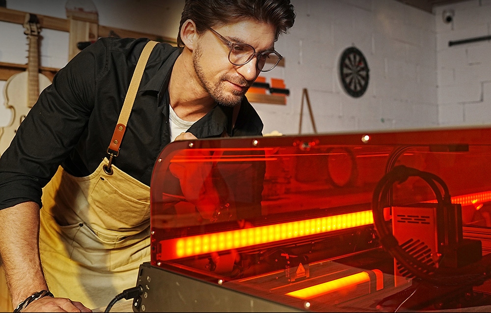 Urządzenie obsługuje tworzenie offline – wystarczy włożyć kartę TF z projektem i rozpocząć pracę bez komputera. Dodatkowo metalowa szuflada umożliwia łatwe usuwanie odpadów produkcyjnych, a przezroczysta osłona z filtrem światła pozwala obserwować cały proces bez konieczności noszenia okularów ochronnych.