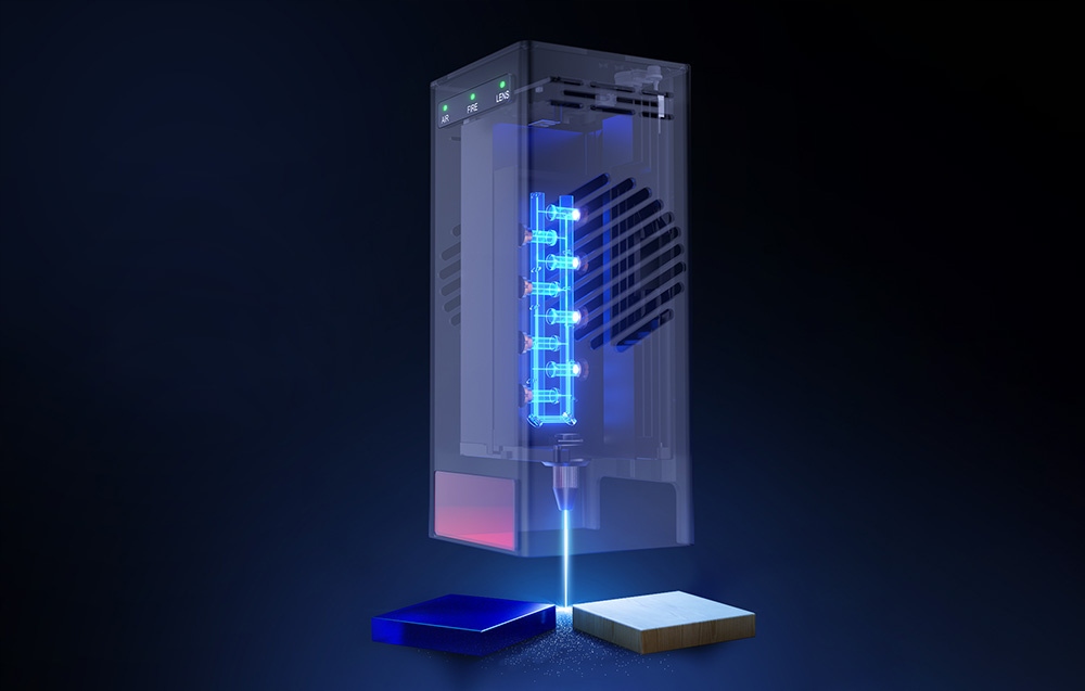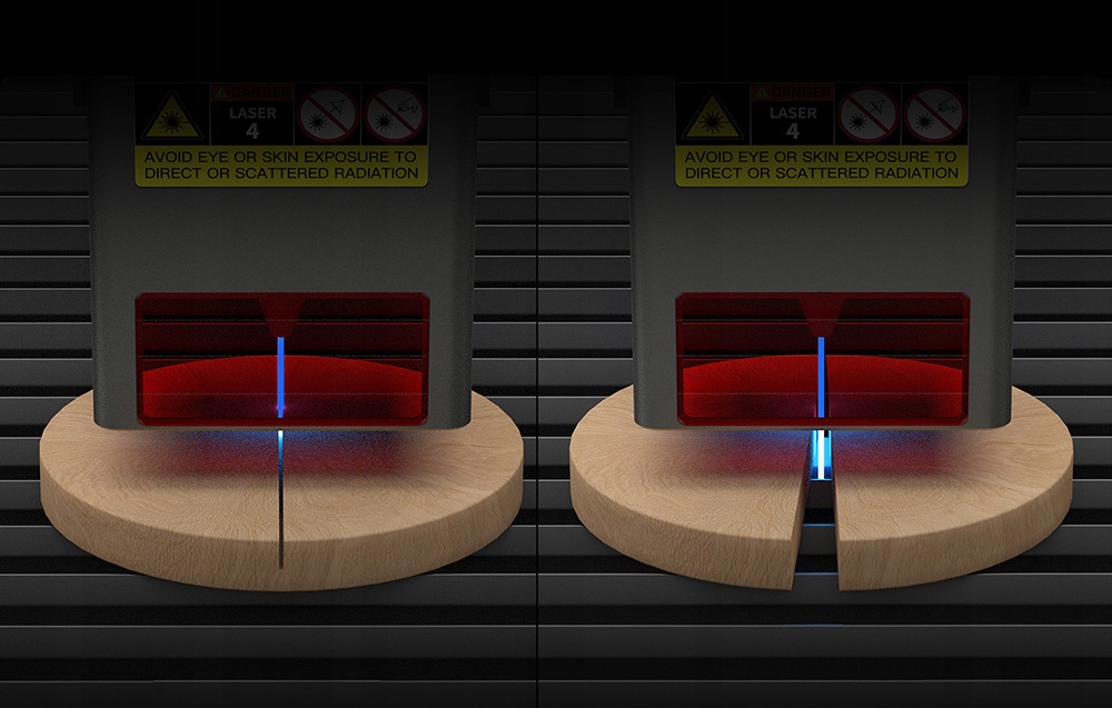 Za wydajność urządzenia odpowiada moduł laserowy 22 W, stworzony z 8 skompresowanych diod 5.5W. Pozwala to bez problemu przecinać materiały takie jak drewno do 20 mm grubości czy kolorowy akryl. Taka moc sprawia, że grawerka radzi sobie nawet z wymagającymi materiałami.