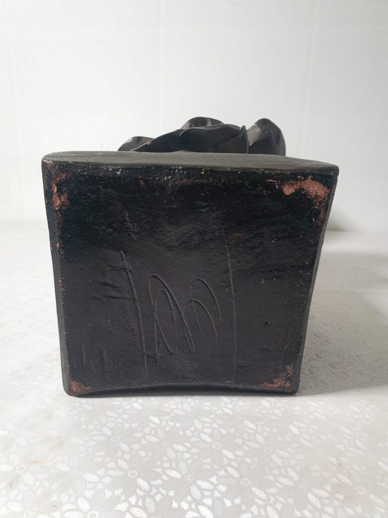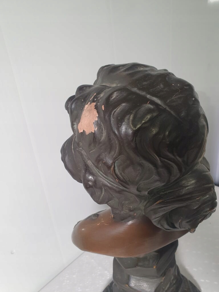 Ozdobne popiersie młodej kobiety w stylu secesyjnym, z napisem „Kreynose” i roślinnym motywem. Sygnatura oraz znak odlewni na podstawie. Rzeźba wykonana z kompozytu/masy imitującej brąz, dekoracyjna, idealna do wnętrz w stylu klasycznym i vintage.