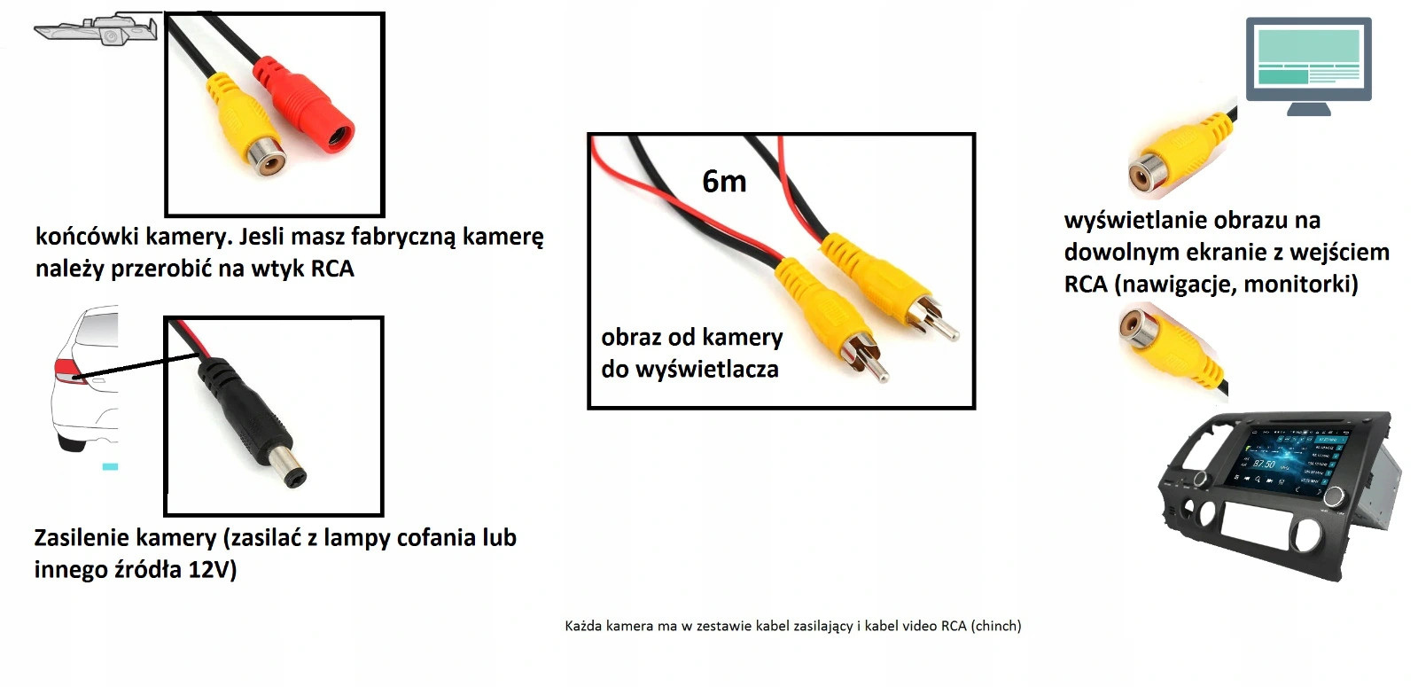 Kamery pasują bez przeróbek do wyświetlania na zewnętrznych uniwersalnych monitorach lub nawigacjach zamiennych. Pasują do każdego wyświetlacza z wejściem na Chinch w systemie PAL.
