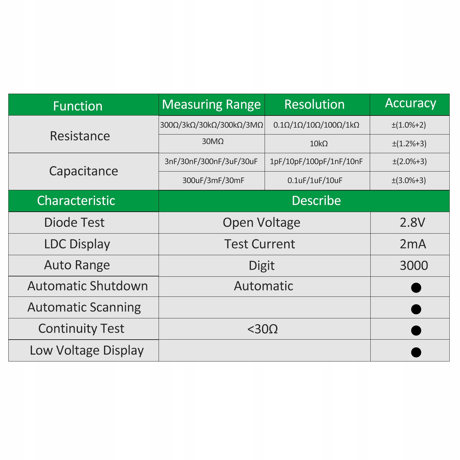 2. Pełny automatyczny pomiar: automatyczne skanowanie oporu, pojemności, dioda.