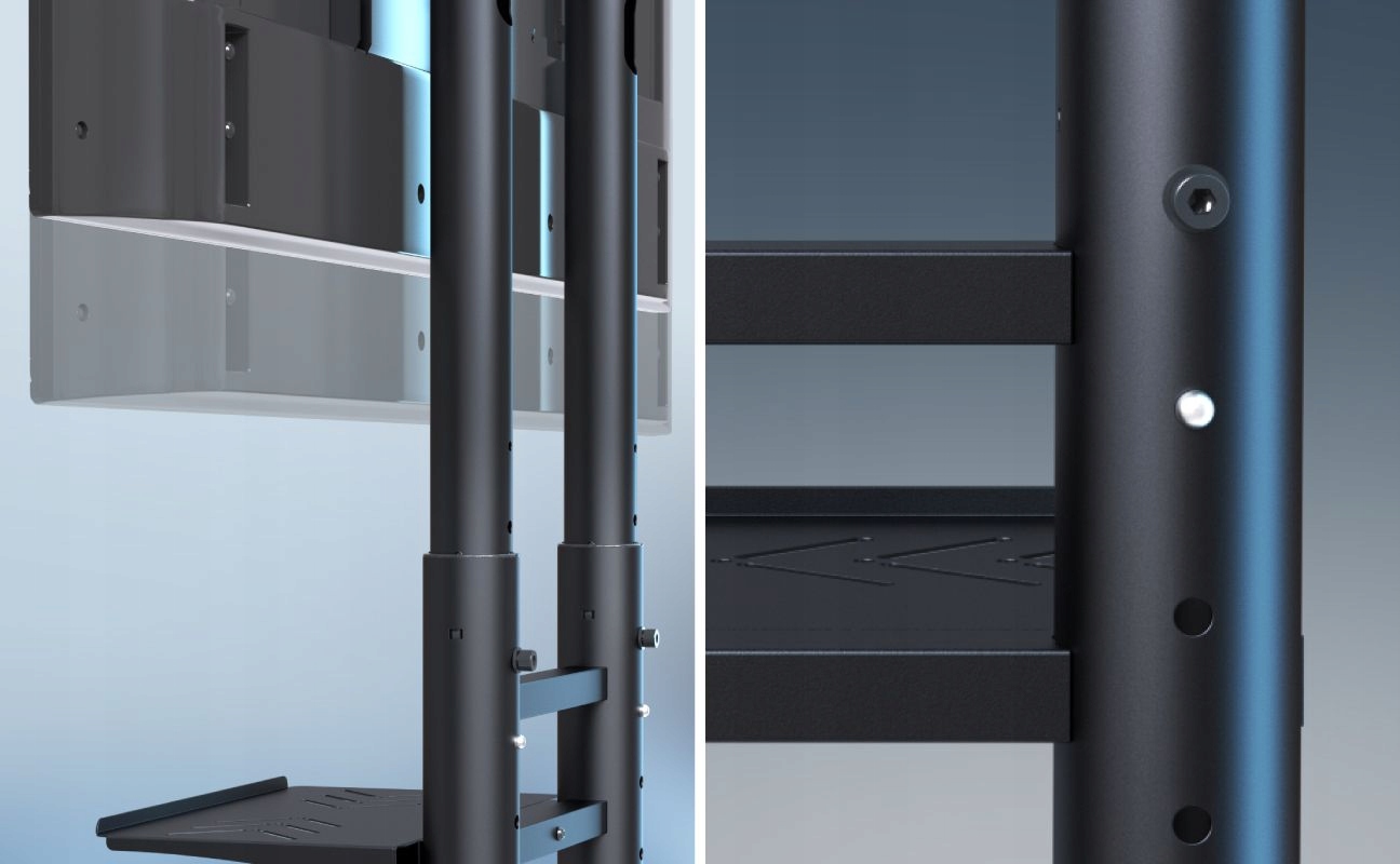 Konstrukcja stojaka pod telewizor wykonana z wysokiej jakości stali gwarantuje długotrwałe użytkowanie. Stojak pod telewizor ze wzmocnioną konstrukcją zapewnia pełną stabilność, a dodatkowy pasek poprzeczny wzmacnia strukturę, co czyni go odpornym na uszkodzenia. Stojak wyposażony jest także w regulację nachylenia ekranu, co pozwala na dostosowanie kąta widzenia w zależności od potrzeb. Podstawa mobilna pod telewizor oraz uchwyt na kamerę o maksymalnej nośności do 5 kg zapewniają komfort i funkcjonalność w pracy.