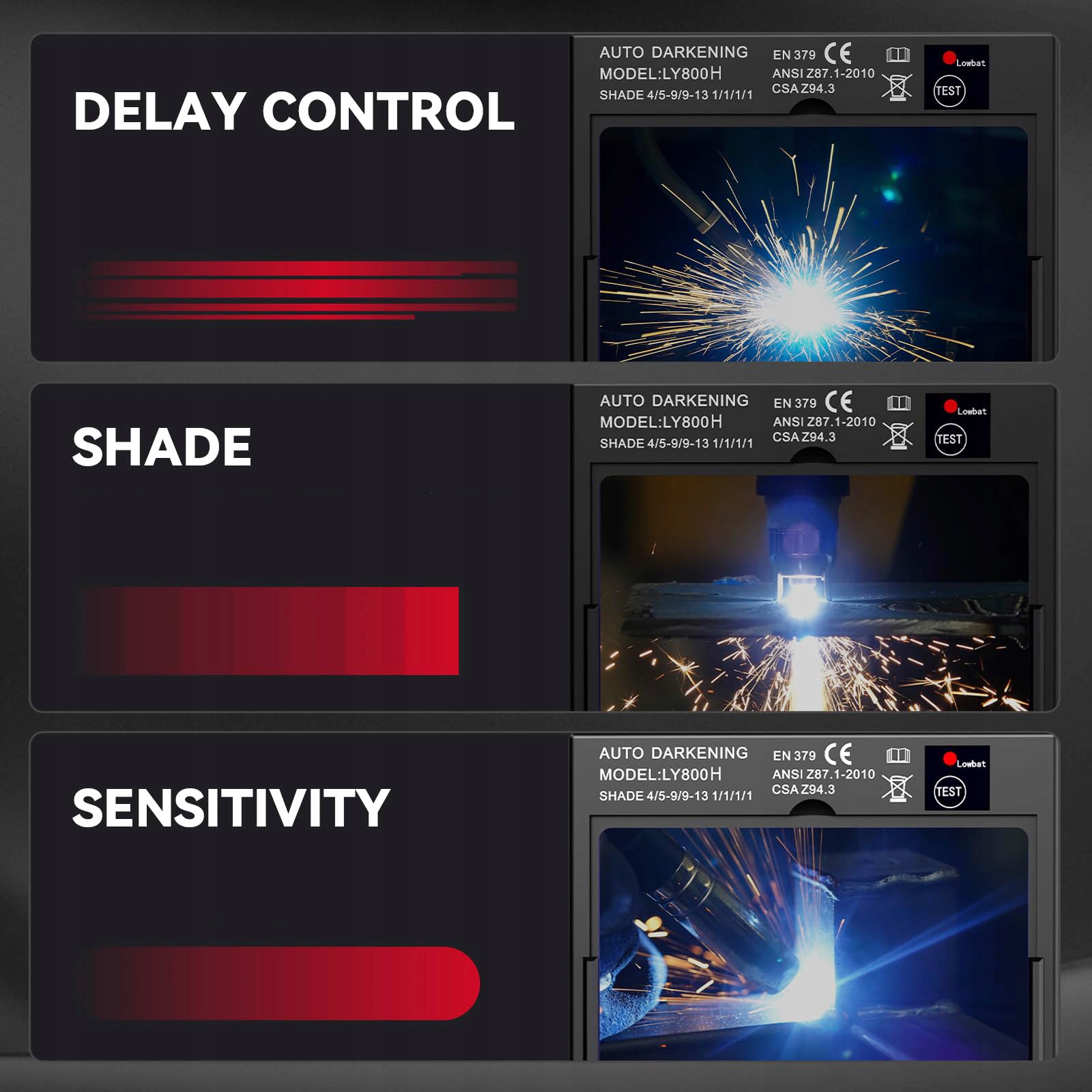 Zaawansowane soczewki samościemniające z 4 czujnikami łuku zapewniają błyskawiczne przejście z stanu jasnego na ciemny w 1/25000 sekundy. Niezawodna ochrona wzroku nawet przy najintensywniejszych pracach.