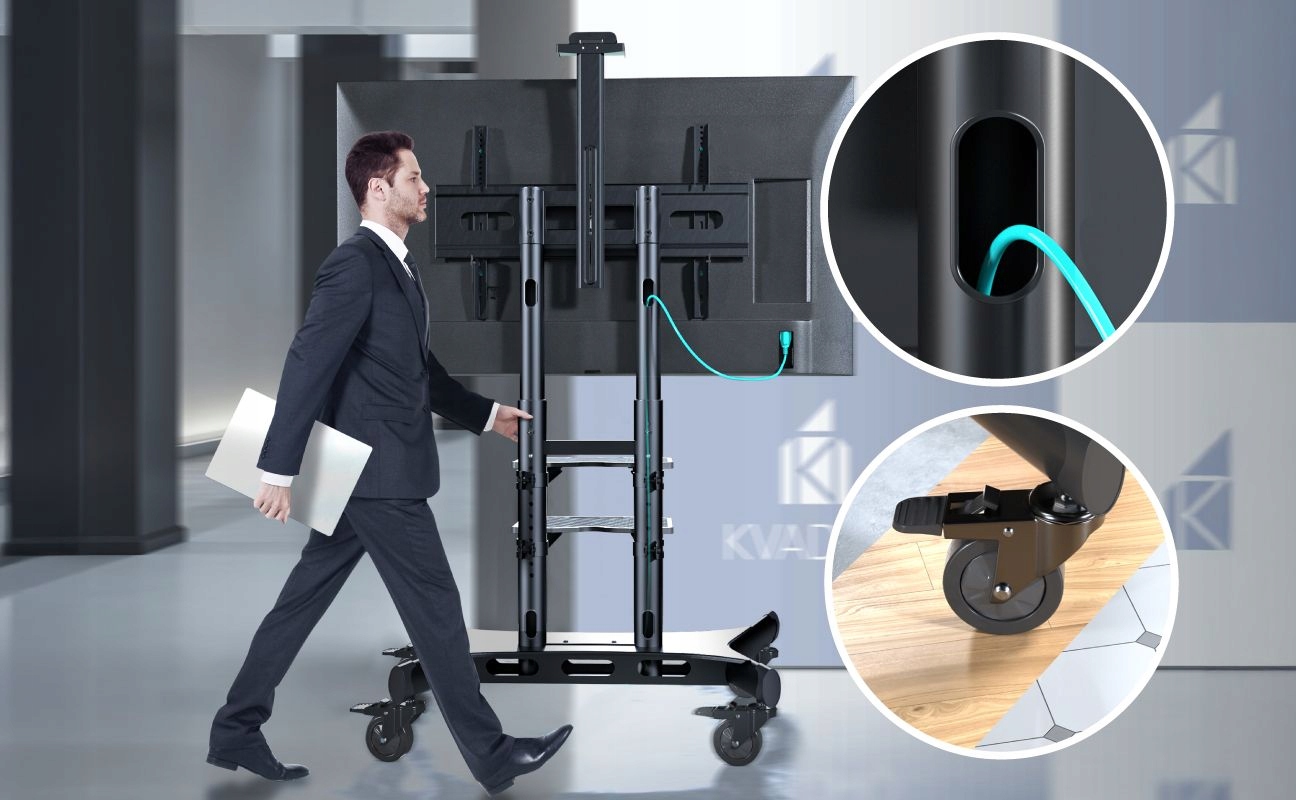 Produkt został zaprojektowany tak, aby jego użytkowanie było intuicyjne i bezpieczne. Stojak pod telewizor jest stabilny, a wkładki ochronne chronią tył ekranu przed zarysowaniami. Konstrukcja gwarantuje komfort użytkowania w biurach, szkołach, salach konferencyjnych i przestrzeniach komercyjnych, a mobilna podstawa pod TV pozwala na łatwe przemieszczanie i wszechstronne zastosowanie.
