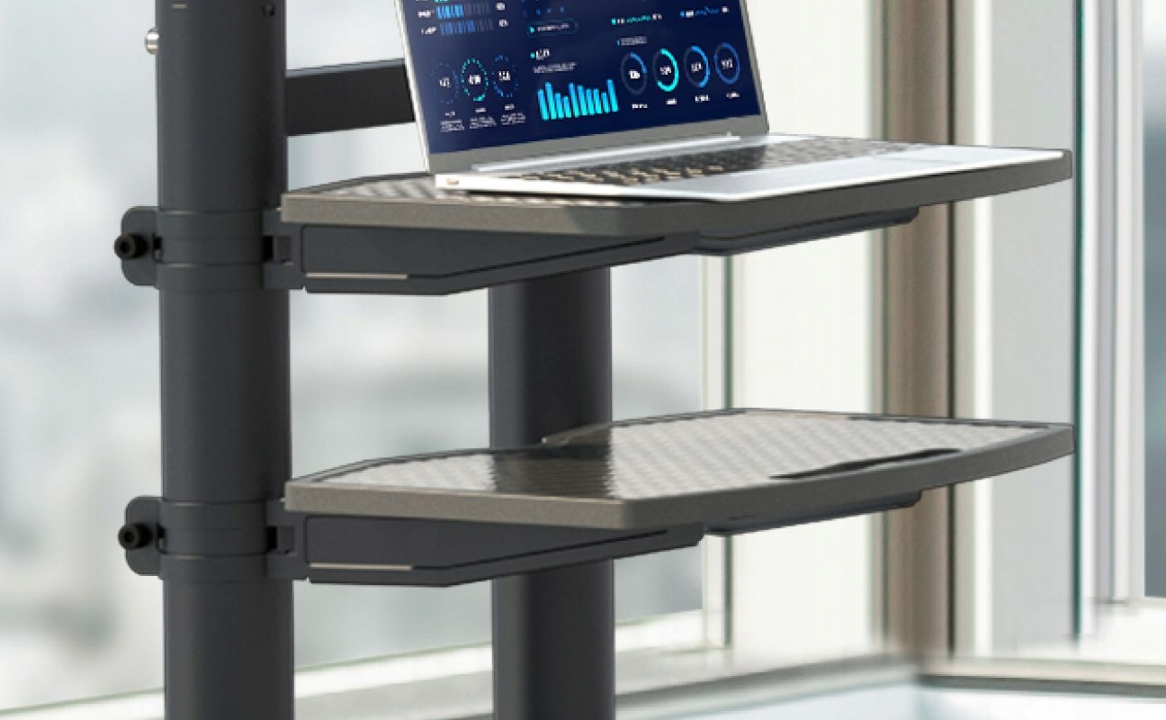 Mobilny stojak pod telewizor z półką posiada dwie regulowane półki, każda o nośności do 5 kg, na urządzenia dodatkowe lub kamery. Stojak na TV z systemem zarządzania kablami pozwala utrzymać porządek w pomieszczeniu. Regulacja nachylenia i wysokości zwiększa komfort oglądania i prezentacji multimedialnych. Mobilna podstawa pod TV zapewnia wszechstronność zastosowania w dużych salach konferencyjnych, a także w przestrzeniach edukacyjnych i biurowych.