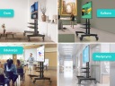 Ten regulowany stojak na telewizor umożliwia łatwe przemieszczanie dużych ekranów, zastępując ciężkie meble RTV. Mobilna podstawa pod TV sprawdza się w biurach, szkołach, a także w przestrzeniach domowych do prezentacji, wykładów lub oglądania filmów. Stojak pod TV z uchwytem na kable umożliwia estetyczne prowadzenie przewodów, a wózek pod TV z hamulcami gwarantuje stabilność podczas transportu.