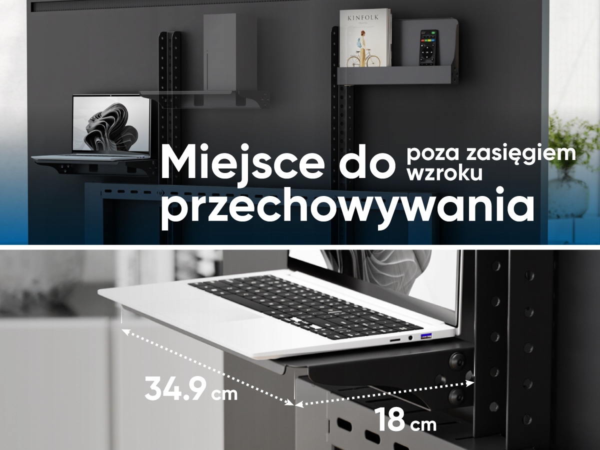 Stojak pod telewizor na kółkach wyposażony jest w wysoko regulowaną półkę, która pomieści urządzenia do 4,5 kg. Na górnej półce można umieścić kamerę PTZ, laptop lub inne urządzenia. Wózek pod TV z hamulcami zapewnia bezpieczeństwo, a stojak pod TV z uchwytem na kable pozwala utrzymać porządek w przestrzeni, zapewniając estetyczne prowadzenie przewodów.
