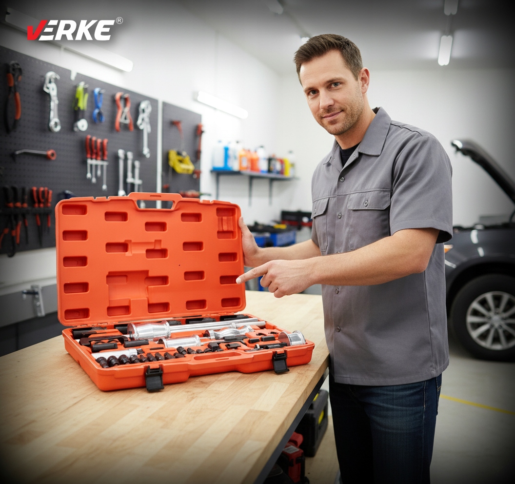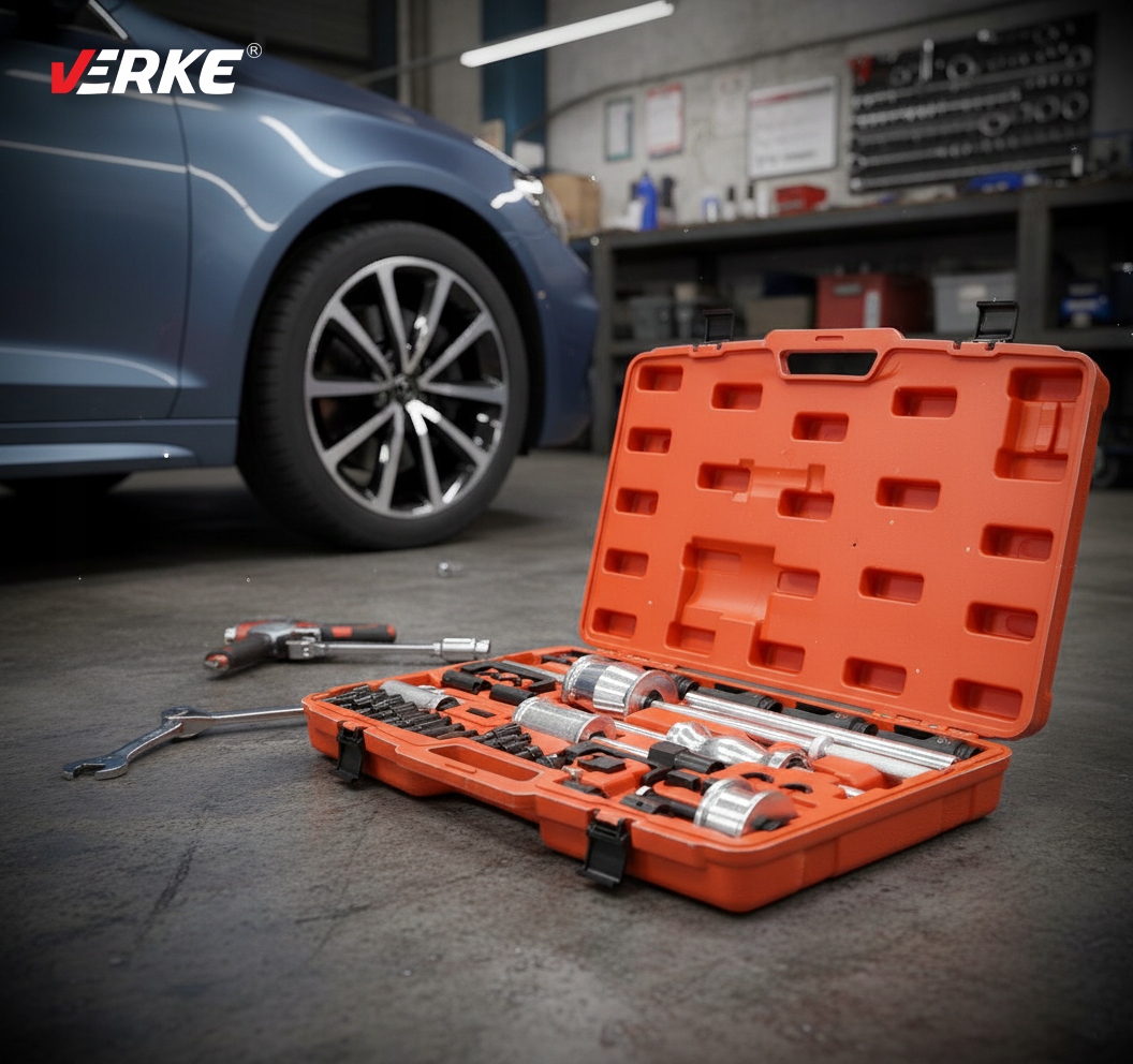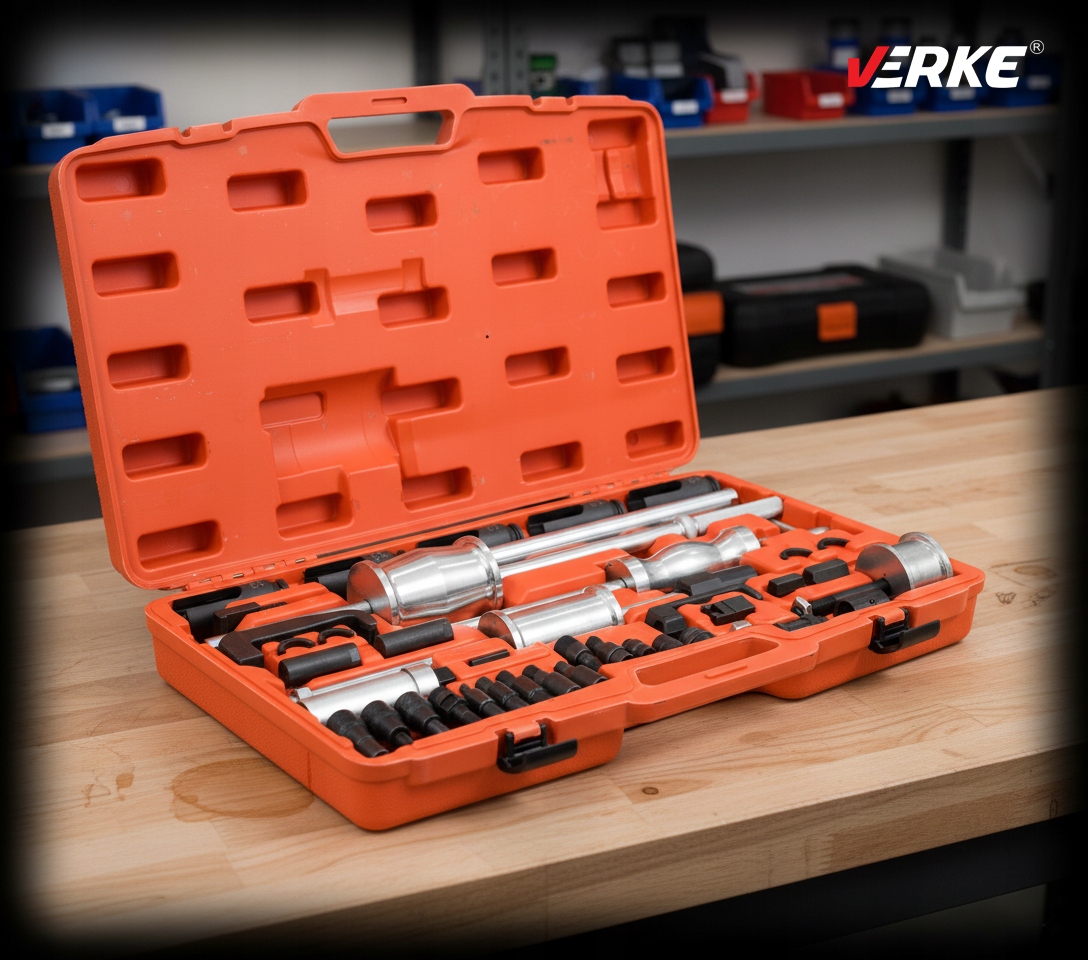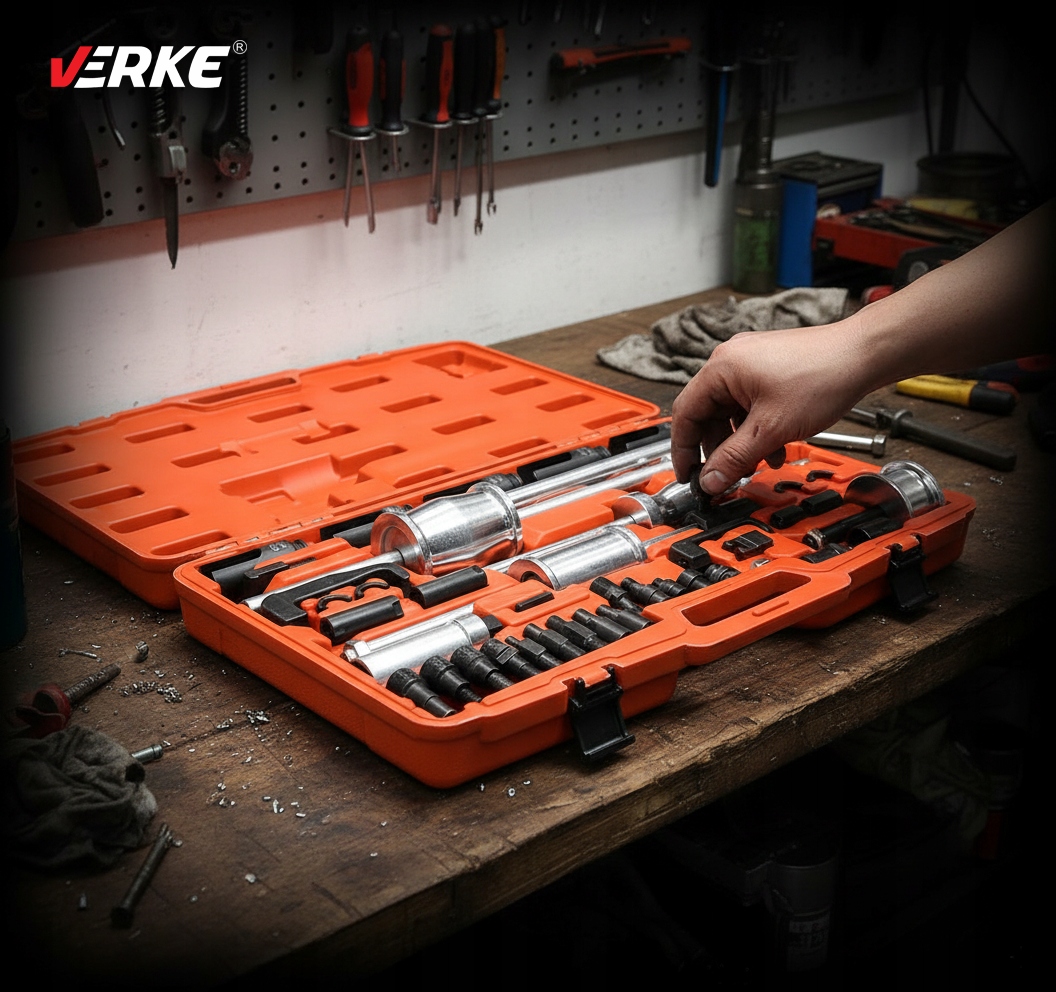Инерционный съемник форсунок марки VERKE является полным, универсальный комплект, предназначенный для демонтажа запеченных форсунок в современных дизельных двигателей типа CDI, CRDI, CR, HDI и других систем общего назначения Rail.
