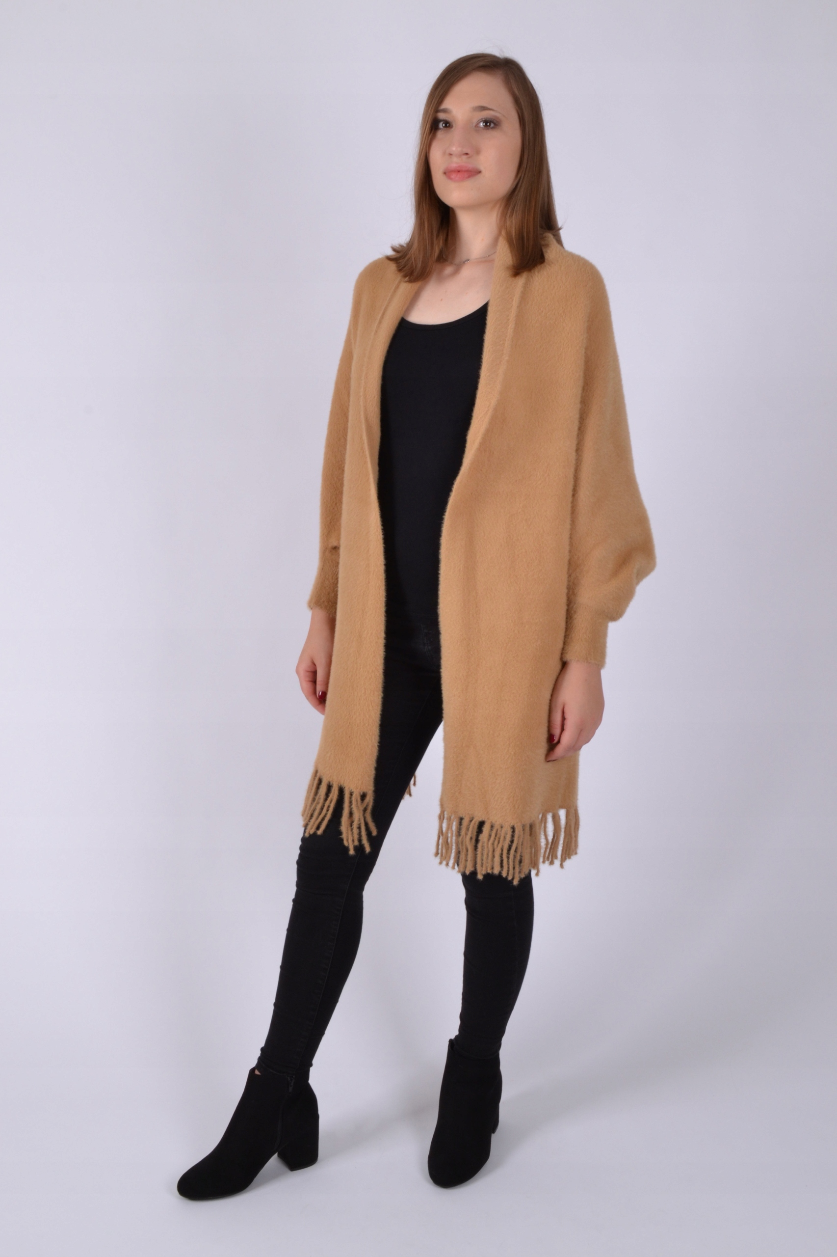 Przedmiotem sprzedaży jest elegancki szal damski z rękawami. Szal wykonany jest z wełny z alpaki. Jest bardzo miękki i miły w dotyku. Na dole zakończony frędzlami. Idealnie pasuje, jako dopełnienie każdej stylizacji! Może być noszony również jako sweter. Dobrze się układa, a dzięki szerokim rękawom nie krępuje ruchów.