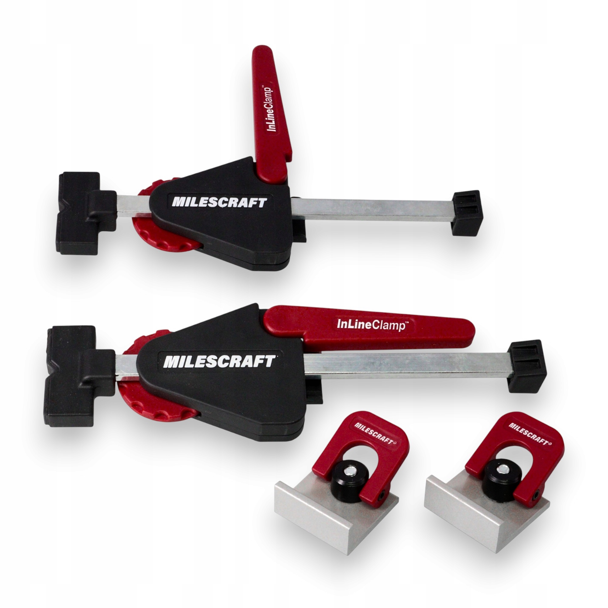 Zestaw zacisków stołowych In-LineClamp (2szt.) oraz ograniczników CamStops (2szt.) Milescraft - szczęki płaskie z szybkim przesuwem do profili T-track.