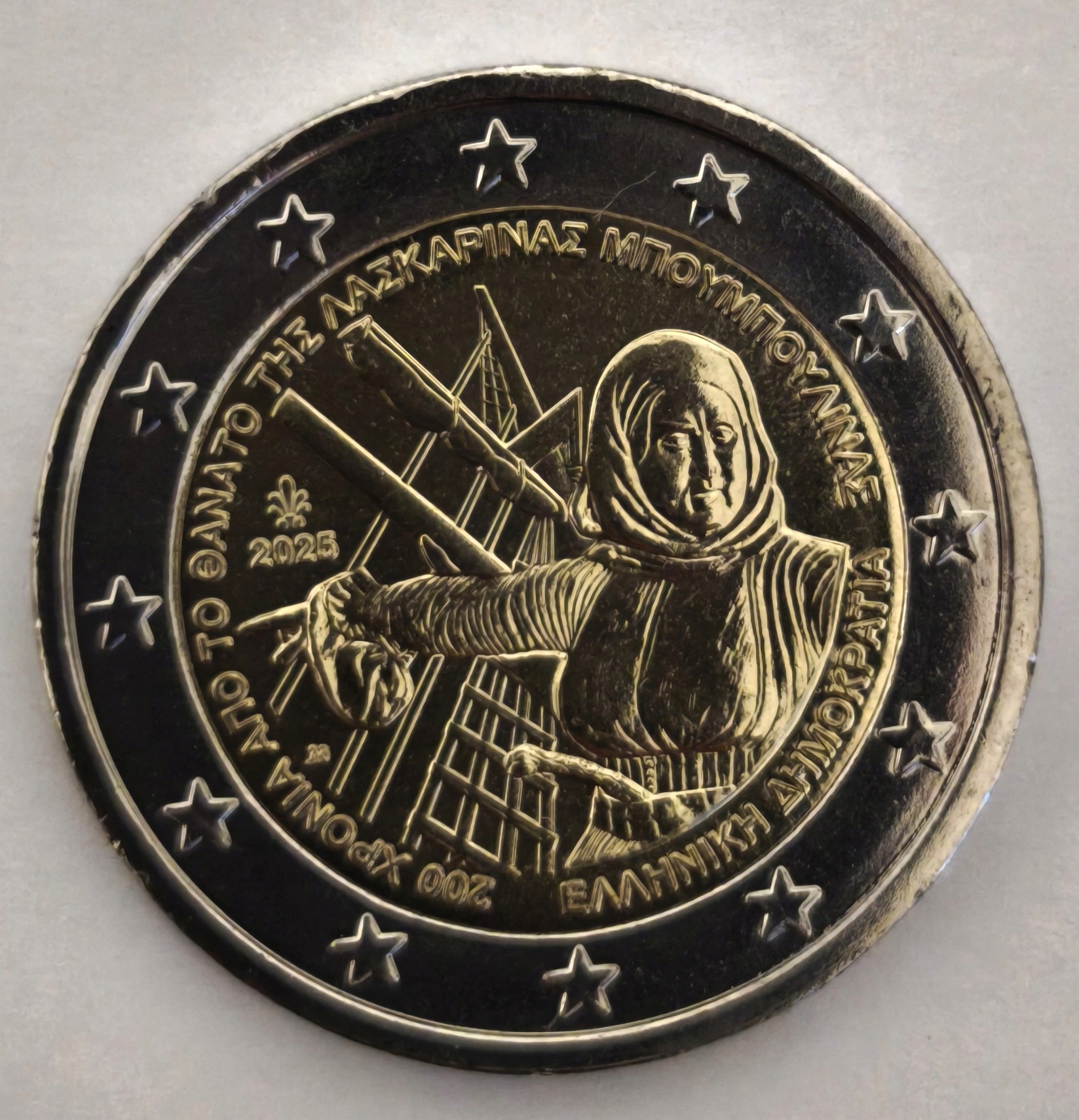 Druga moneta okolicznościowa wyemitowana przez Grecję w 2025 roku świętuje 200. rocznicę śmierci Laskariny Boubouliny (1771–1825), bohaterki wojny o niepodległość Grecji przeciwko Imperium Osmańskiemu.