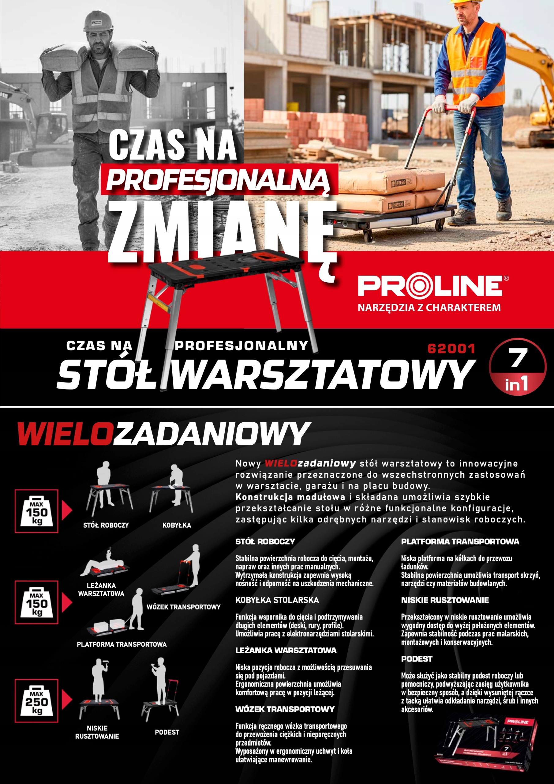 Profesjonalne rozwiązanie, które łączy w sobie aż 7 funkcji w jednym urządzeniu.Składany stół warsztatowy Proline 62001 to idealne wsparcie dla majsterkowiczów, fachowców oraz osób ceniących porządek i mobilność.