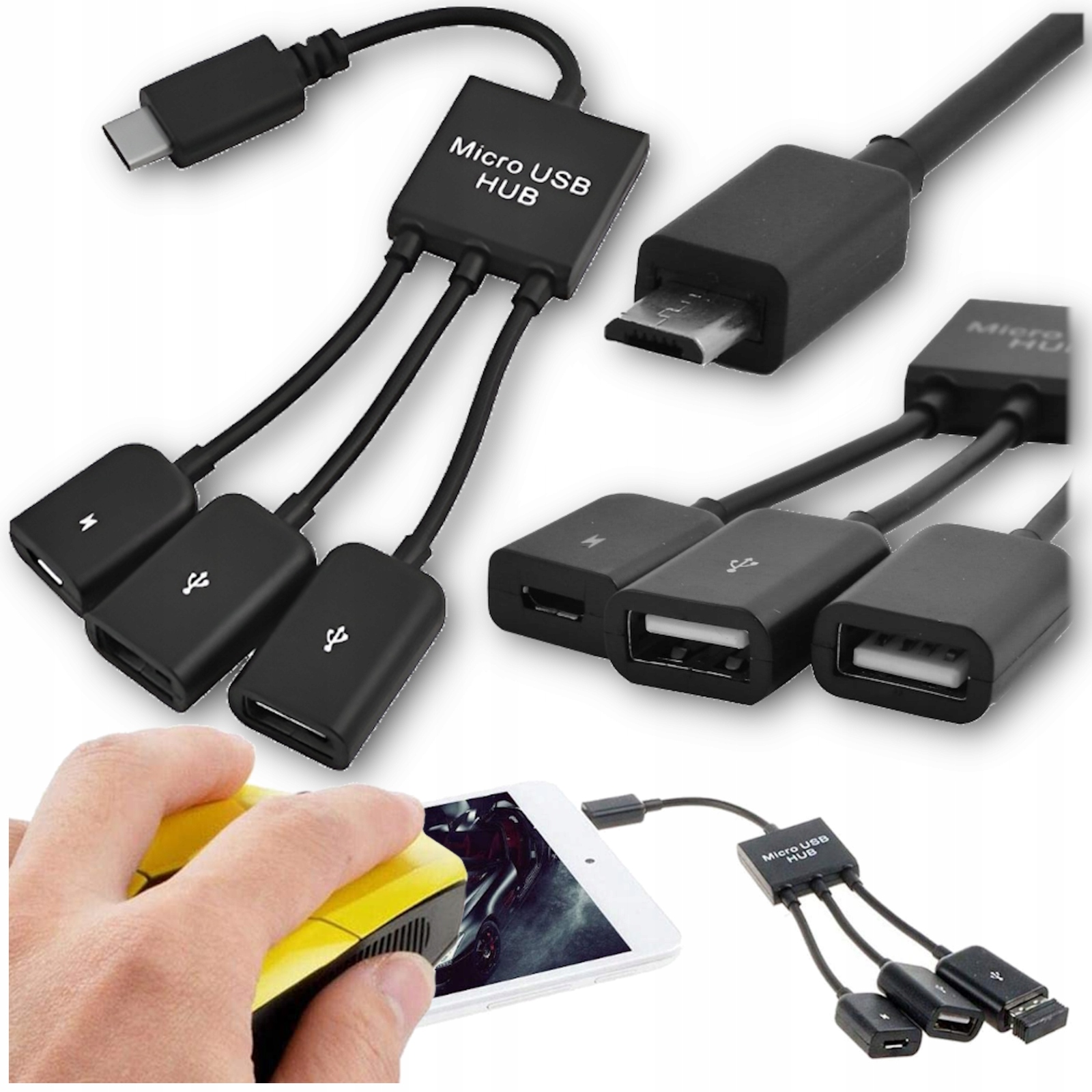 Huba podłączamy do telefonu / tabletu ze złączem micro USB. Dzięki złączom USB do telefonu możemy podłączyć np. klawiaturę oraz myszkę, ew: pendrive i inne. Do złącza zasilania podłączamy ładowarke aby zapewnić zasilanie podłączonym urządzeniom.