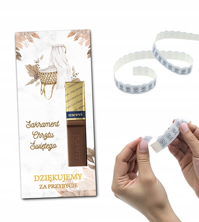W zestawie tasiemki samoprzylepne dwustronne do przyklejenia czekoladek (czekoladka nie jest w zestawie)