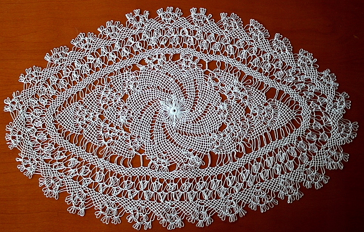Frywolitka w kolorze śnieżnej bieli,to technika ,która zachwyca swoja misternością wykonywana za pomocą czółenek.Ta jest szczególna ze względu na zastosowanie oryginalnej niezwykle cieniutkiej nitki w kolorze śnieżnej perły. Rarytasik koronkowy.