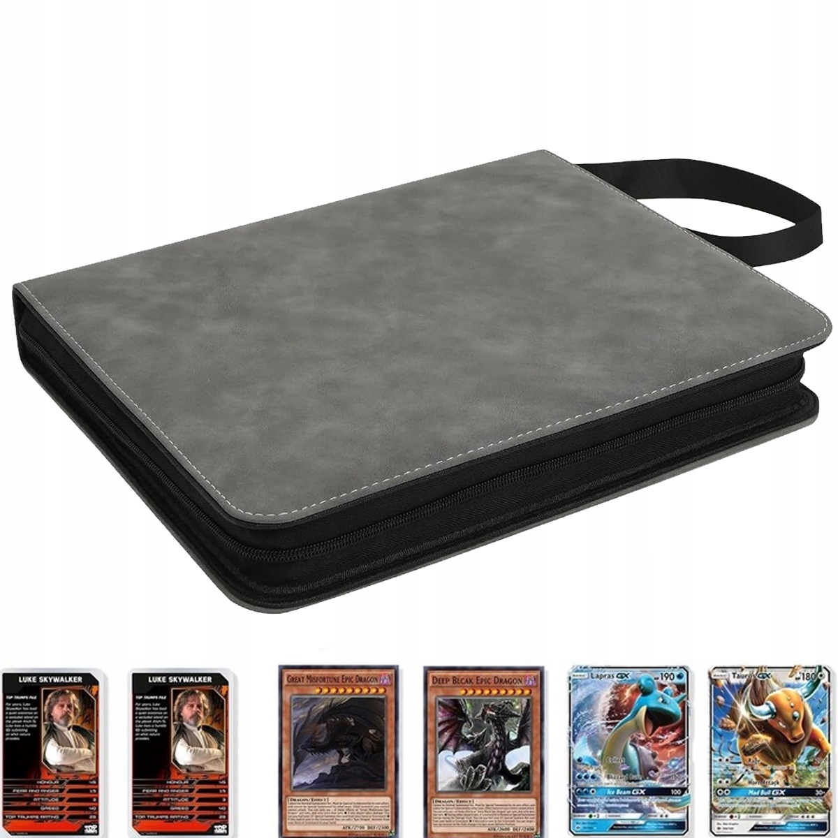 Wysokiej jakości zamsz PU zapewnia wygodę i antypoślizgowy uchwyt. Ulepszony uchwyt do przenoszenia i ultradźwiękowo zgrzewane strony (bez pierścienia) sprawiają, że ten segregator na karty do gry jest po prostu nie do odparcia. Wymiary 34,5 x 25,5 x 5 cm idealnie nadają się do organizacji kart i wygodnego zabierania kart TCG w dowolne miejsce.