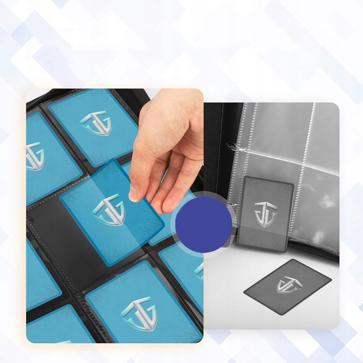 Boczny mechanizm ładowania kart pozwala na łatwy dostęp bez przypadkowego wypadania kart. Przezroczyste kieszonki segregatora na karty wyraźnie eksponują karty i umożliwiają szybki dostęp, dzięki czemu wspólna gra w karty jest jeszcze przyjemniejsza. Nasz ulepszony model posiada uchwyt do przenoszenia, który ułatwia transport!