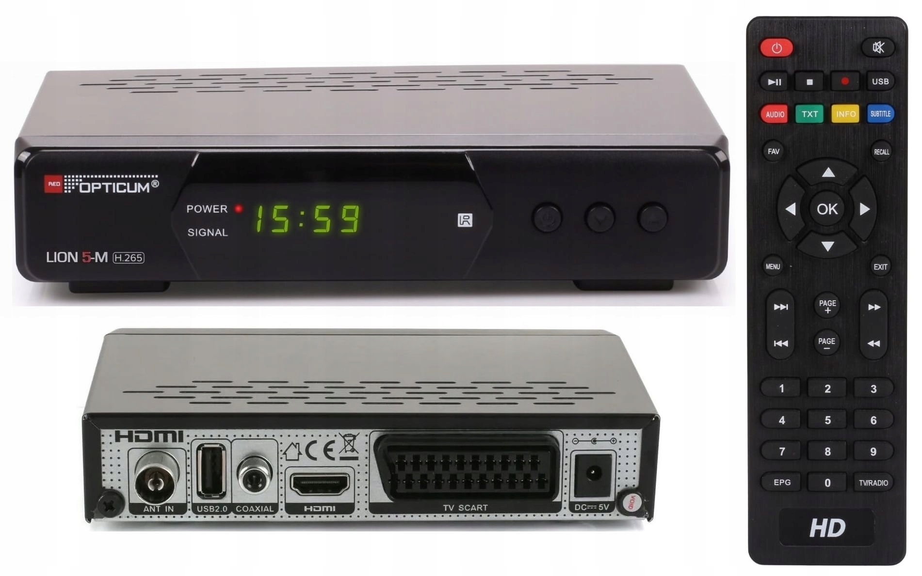 Opticum AX LION 5-M posiada na przednim panelu wyświetlacz numeryczny oraz przyciski zmiany kanałów i wyłączenia. Menu w języku polskim. Umożliwia podłączenie do telewizora poprzez złącze SCART (EURO) oraz HDMI dla przesyłu wysokiej rozdzielczości Full HD 1080P.