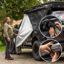Zadaszenie Space+ to nie tylko ochrona, ale również przestrzeń do odpoczynku i pracy w terenie. Dzięki szerokiemu zasięgowi 270° możliwy jest swobodny dostęp do bagażnika, lodówki, kuchni turystycznej czy przestrzeni do spania. To rozwiązanie szczególnie przydatne podczas dłuższych wypraw, gdy każda dodatkowa przestrzeń użytkowa ma znaczenie.