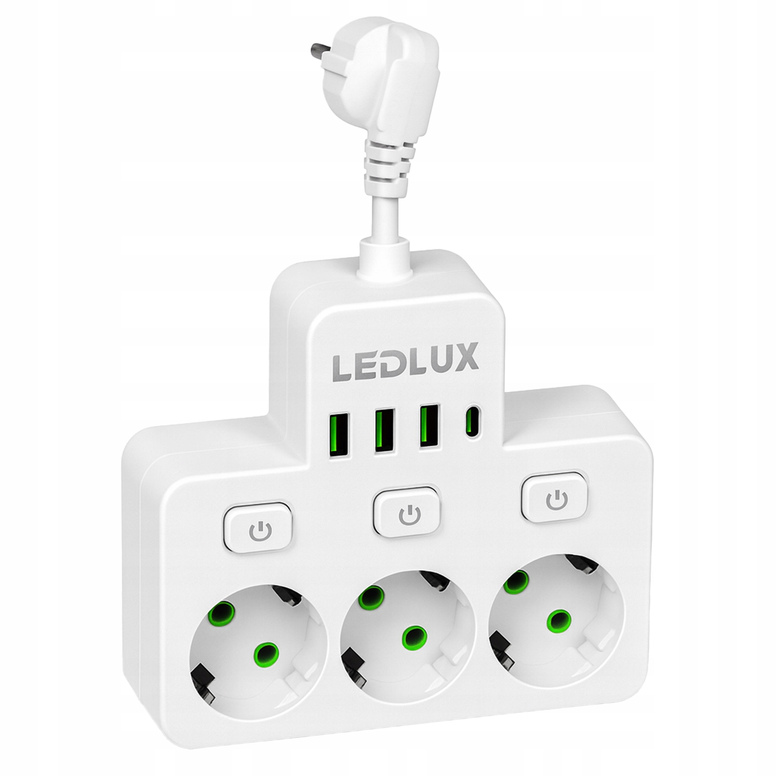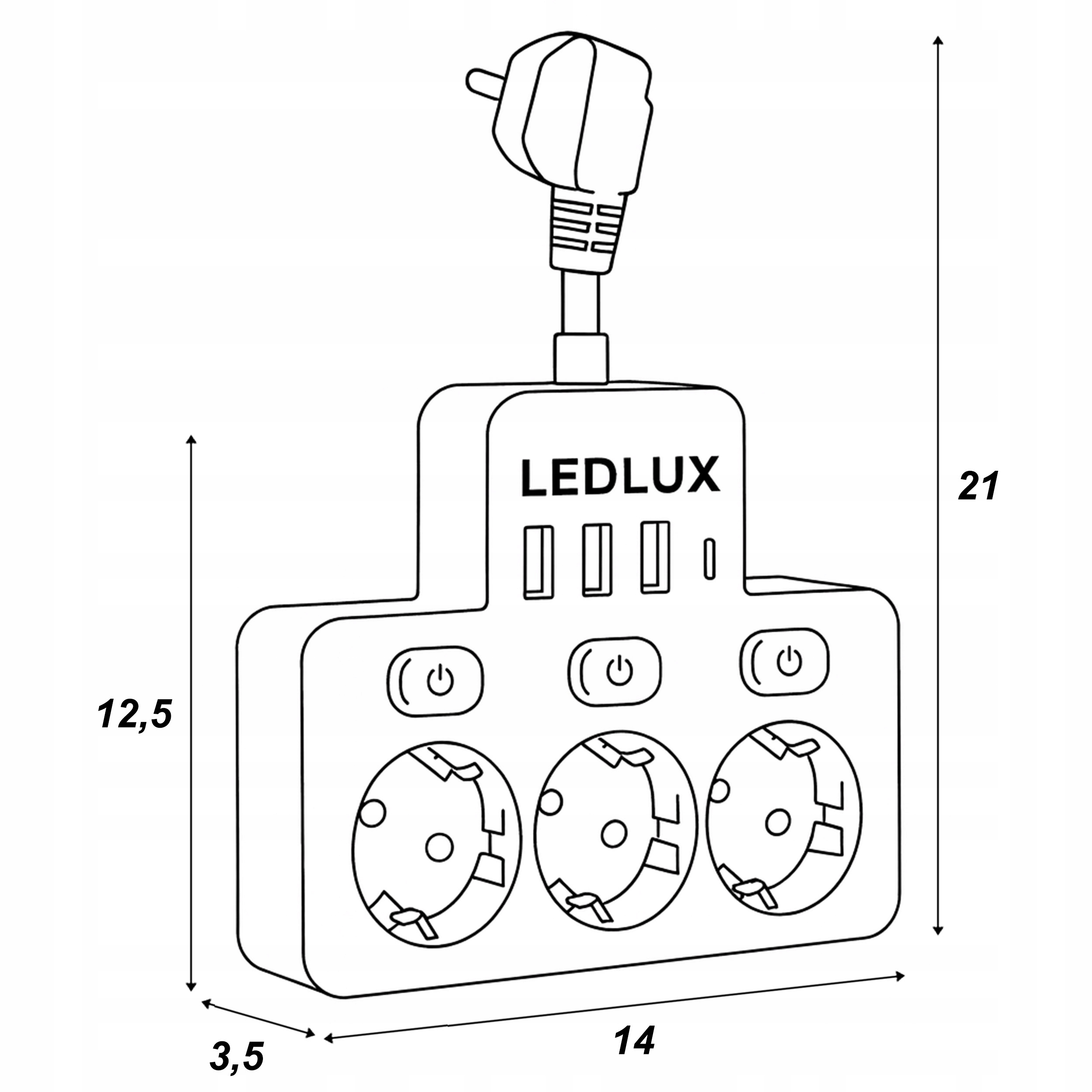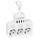 Kompaktowy adapter LEDLUX zmienia jedno gniazdko w stację zasilania: masz do dyspozycji 3 gniazda 230V z uziemieniem oraz 4 porty USB (3× USB-A + 1× USB-C). Trzy osobne włączniki pozwalają wyłączać każde gniazdo sieciowe niezależnie—bez wyciągania wtyczek. Smukła, biała obudowa (ok. 14 × 12,5 × 3,5 cm, wysokość całkowita 21 cm) porządkuje przestrzeń przy łóżku, w salonie i przy biurku.