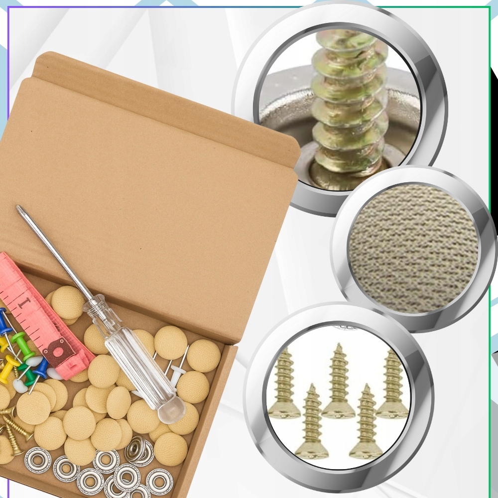 ✅ W zestawie znajdziesz 70 beżowych nitów naprawczych z tkaniny siatkowej i metalu, 70 kolorowych pinezek, a także śrubokręt i centymetr krawiecki. To kompletny pakiet, który zawiera wszystkie narzędzia niezbędne do estetycznej i trwałej naprawy.