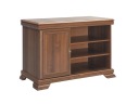 Stolik został zaprojektowany z myślą o praktycznym przechowywaniu sprzętu RTV i akcesoriów. Składa się z dwóch części: zamykanej szafki z drzwiczkami, za którymi znajduje się jedna półka, oraz otwartej przestrzeni z trzema wnękami na urządzenia audio-wideo. Stylizowane nóżki o wysokości 5 cm oraz metalowe uchwyty w kolorze złota dodają mu szyku i podkreślają klasyczny charakter mebla.