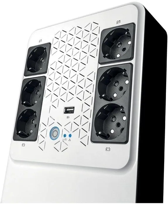 UPS o mocy pozornej 800 VA wyposażony w elektroniczny układ AVR. Praca w trybie Line-Interactive. 6 gniazd zasilających, 1 gniazdo USB oraz RJ45.