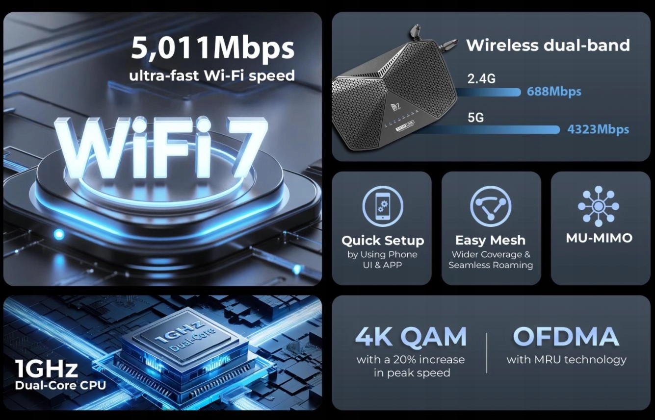 Router BE5100R oferuje wysoką prędkość przesyłania danych dzięki Wi-Fi 7 (802.11be). Maksymalna prędkość na pasmie 5 GHz wynosi 4323 Mbps, a na pasmie 2,4 GHz 688 Mbps. Dzięki temu użytkownicy mogą cieszyć się szybkim i stabilnym połączeniem, niezależnie od liczby podłączonych urządzeń.
