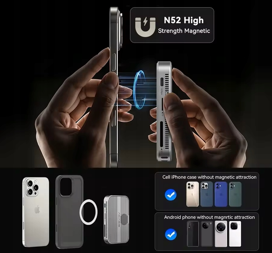 Magnetyczny system N52 sprawia, że Twój telefon idealnie przylega do stacji ACASIS i nie przesuwa się nawet przy intensywnym użytkowaniu.