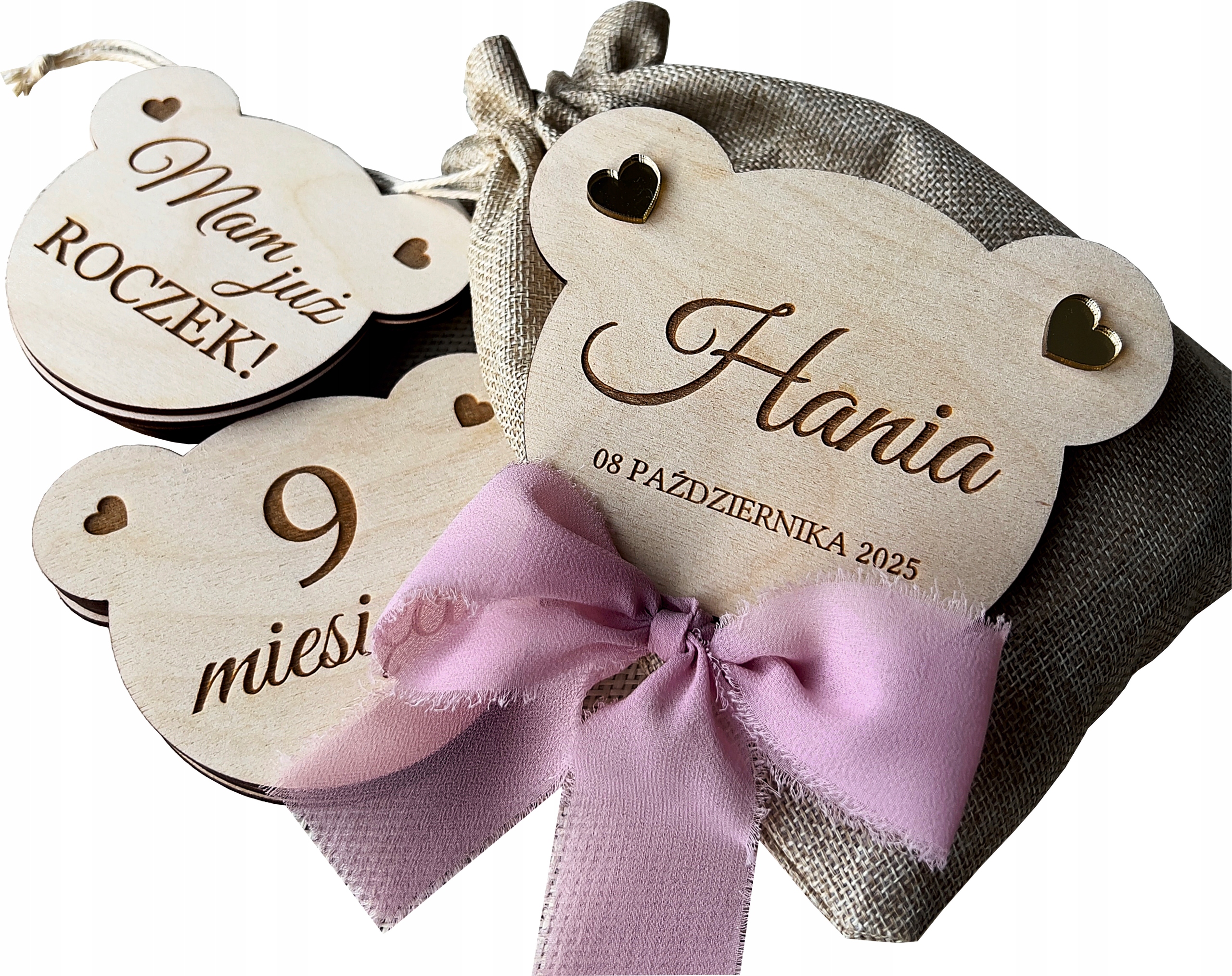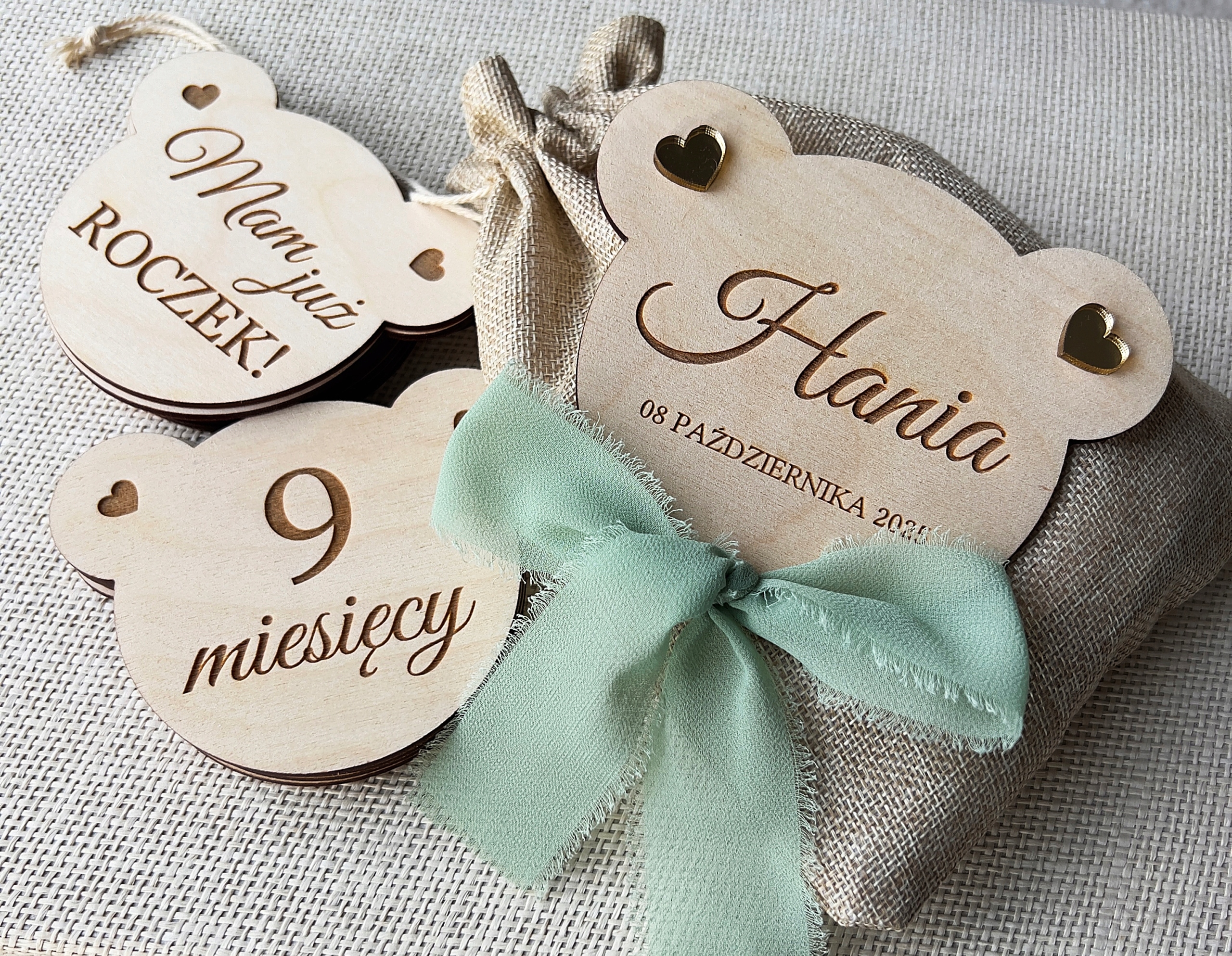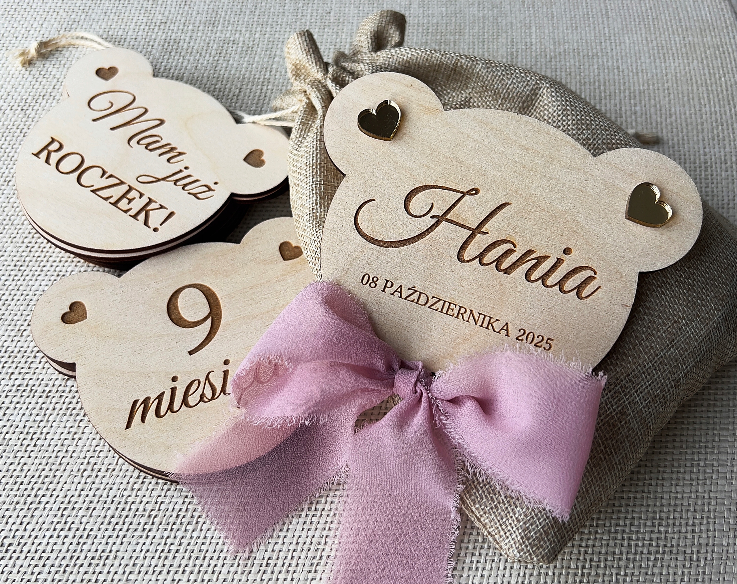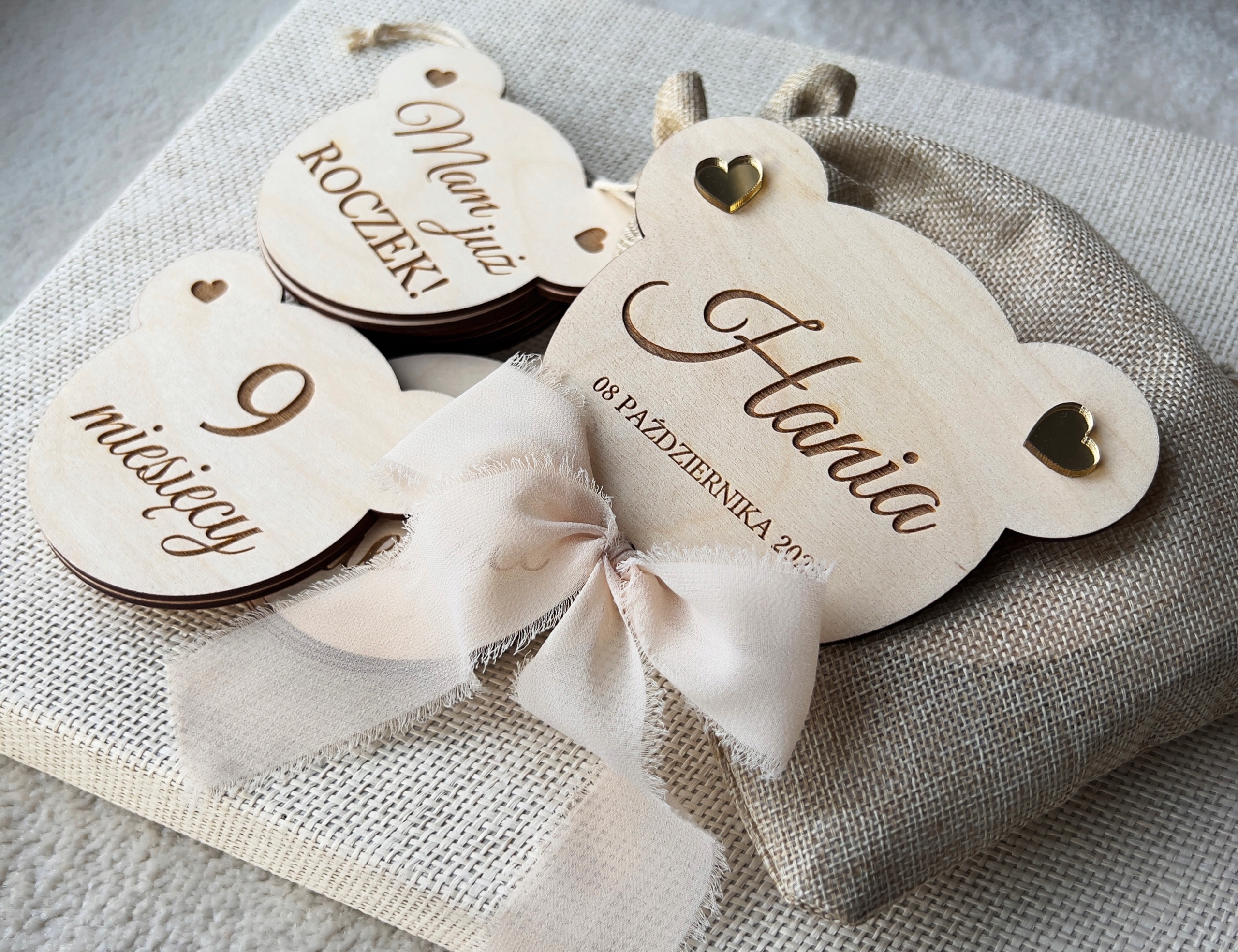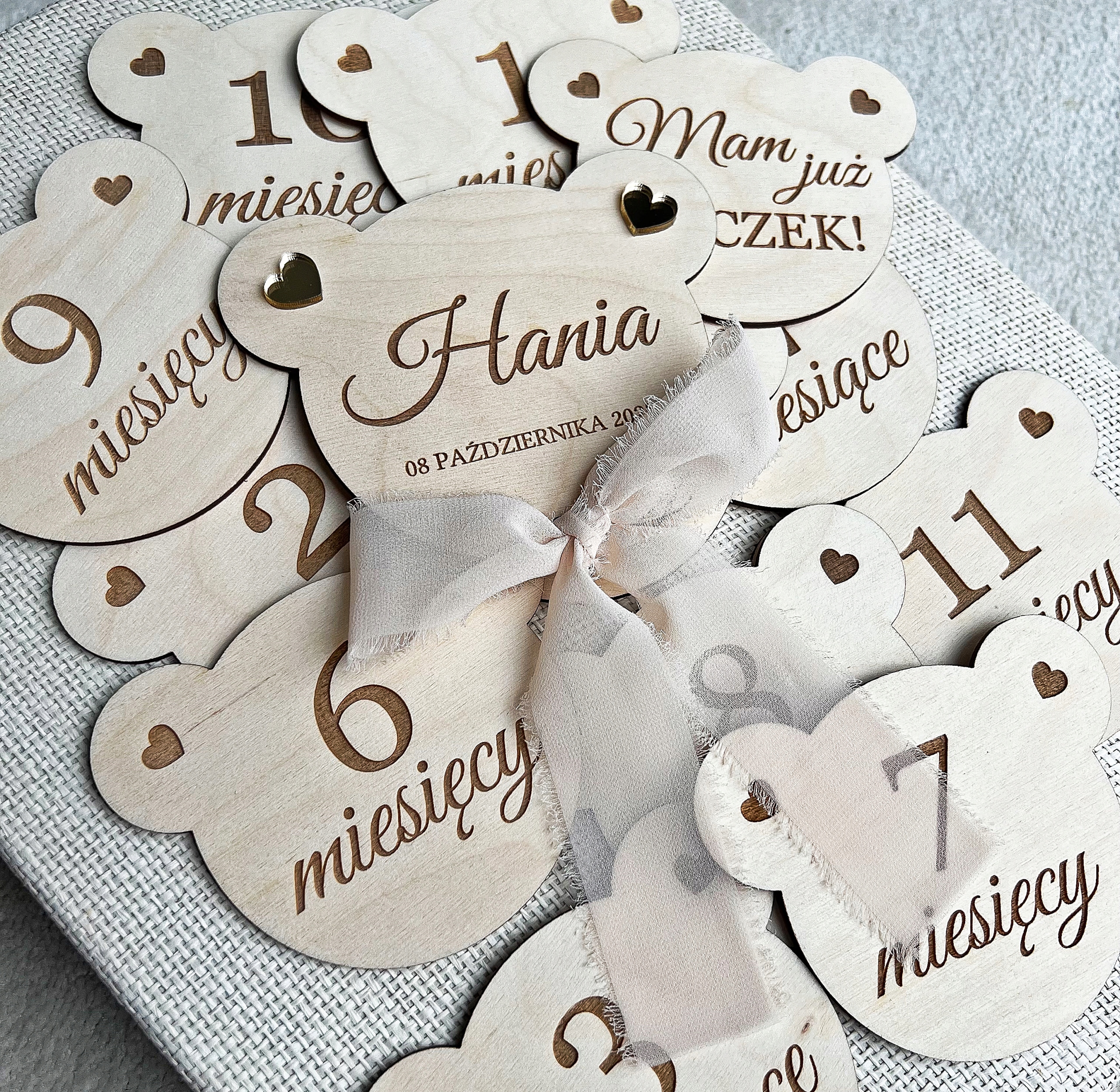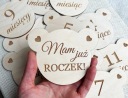 Śliczne tabliczki w kształcie głowy misia z wygrawerowanymi miesiącami.