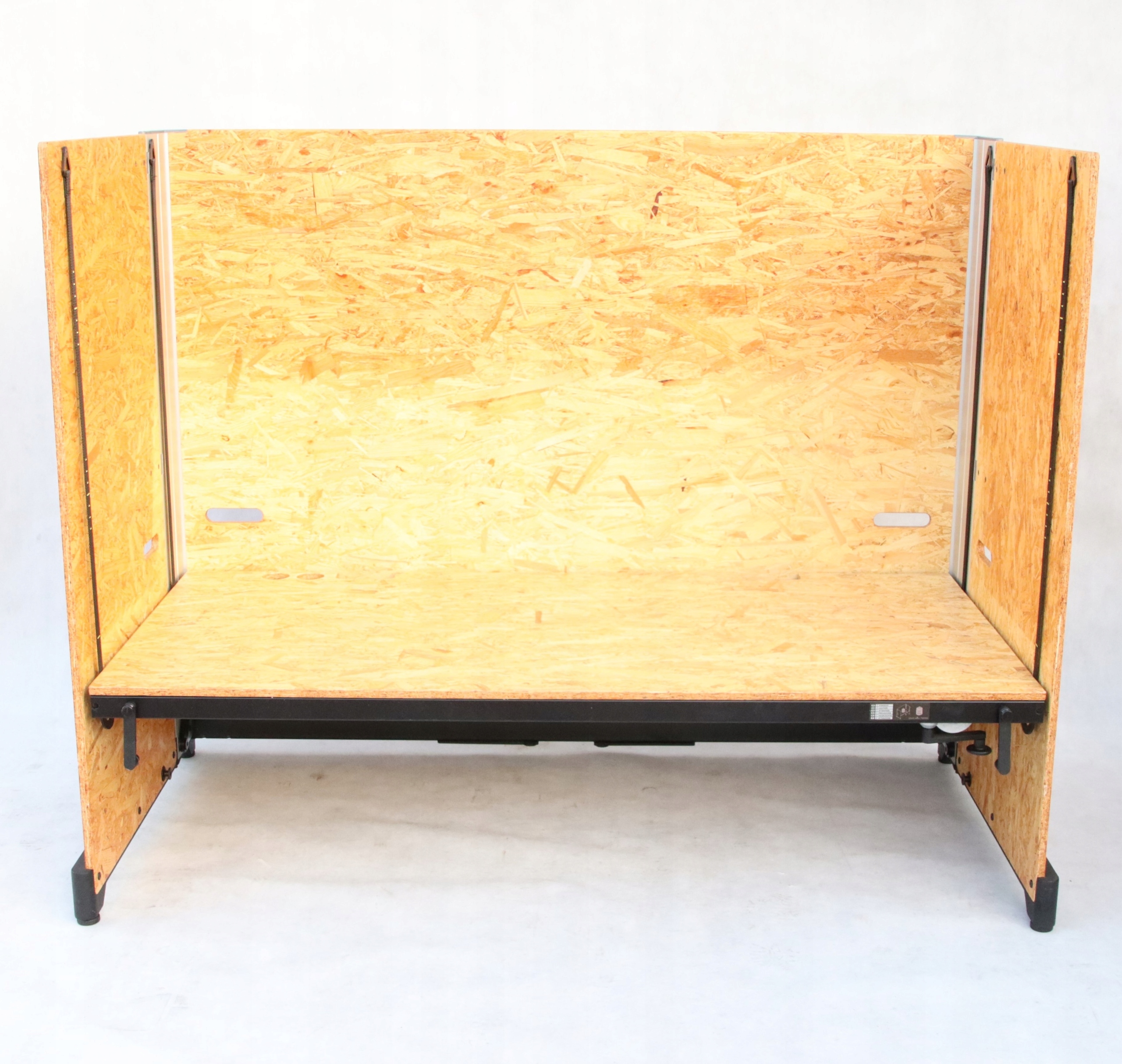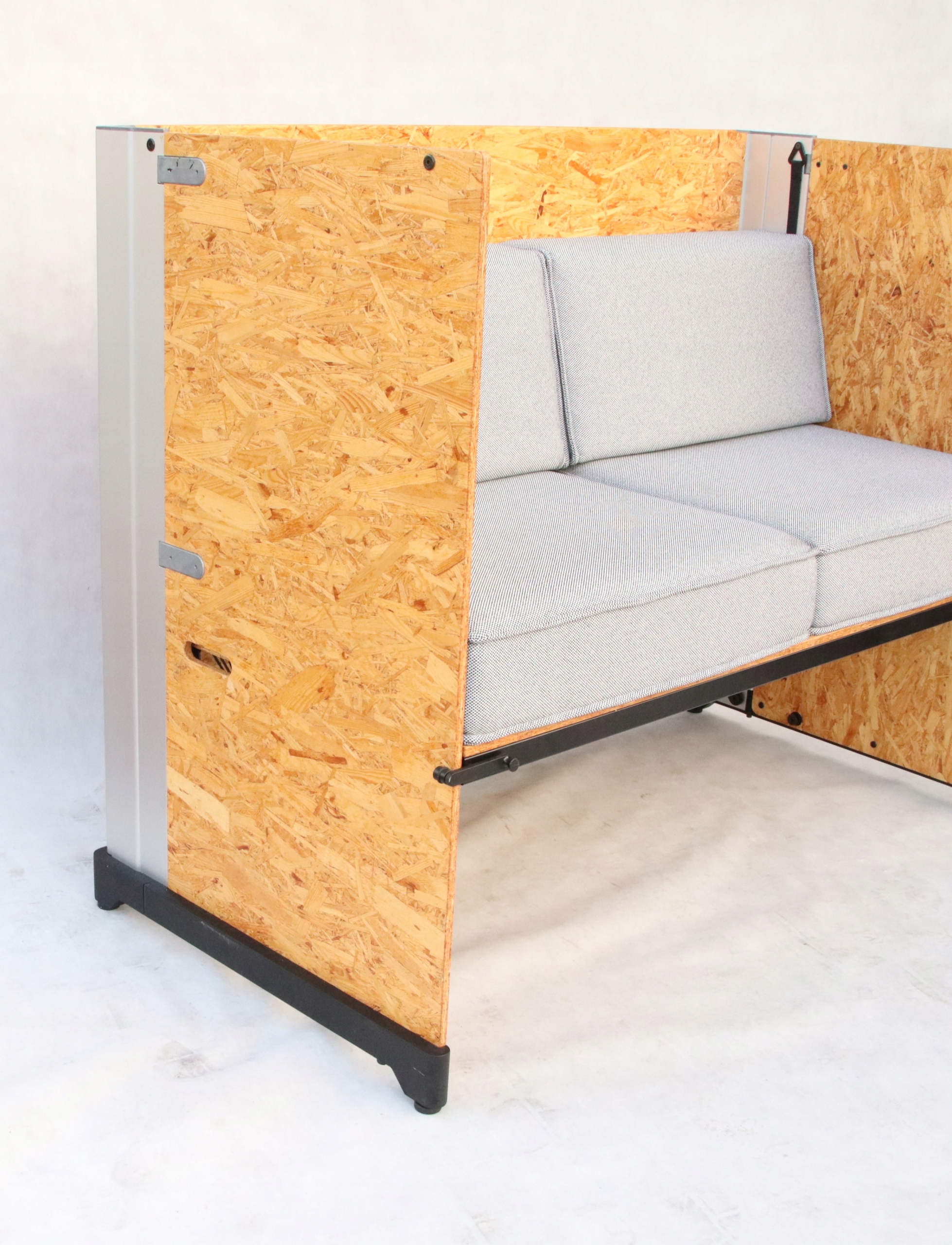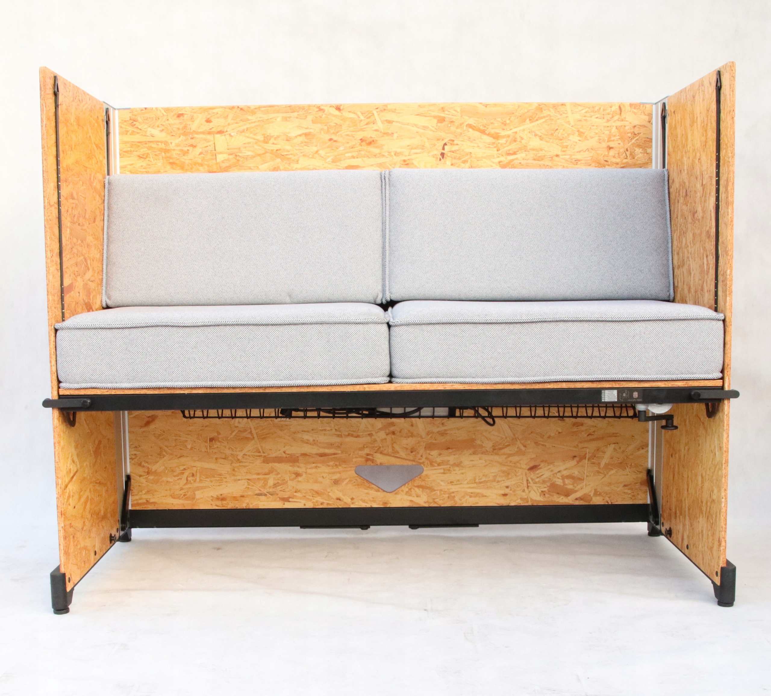 Kanapa jest wykonane z prostokątnych paneli z płyty OSB, które mocuje się w metalowych uchwytach. Dzięki temu możliwe jest podnoszenie lub obniżanie powierzchni biurka, aby użytkownicy mogli pracować na siedząco lub na stojąco.