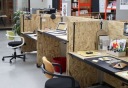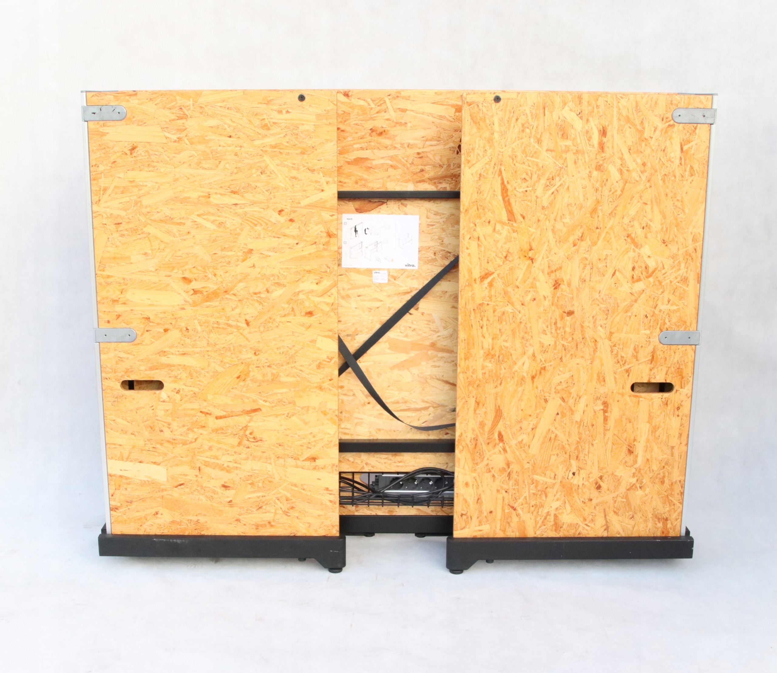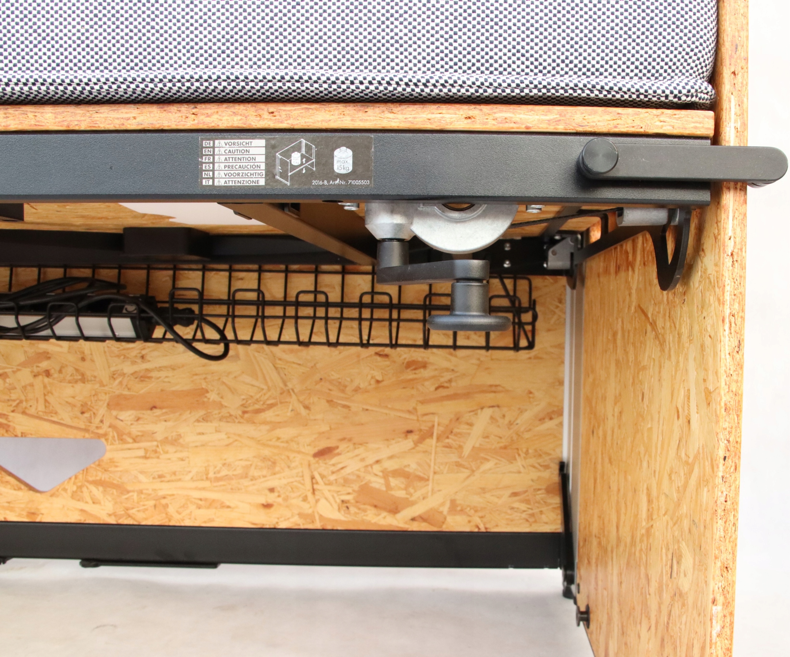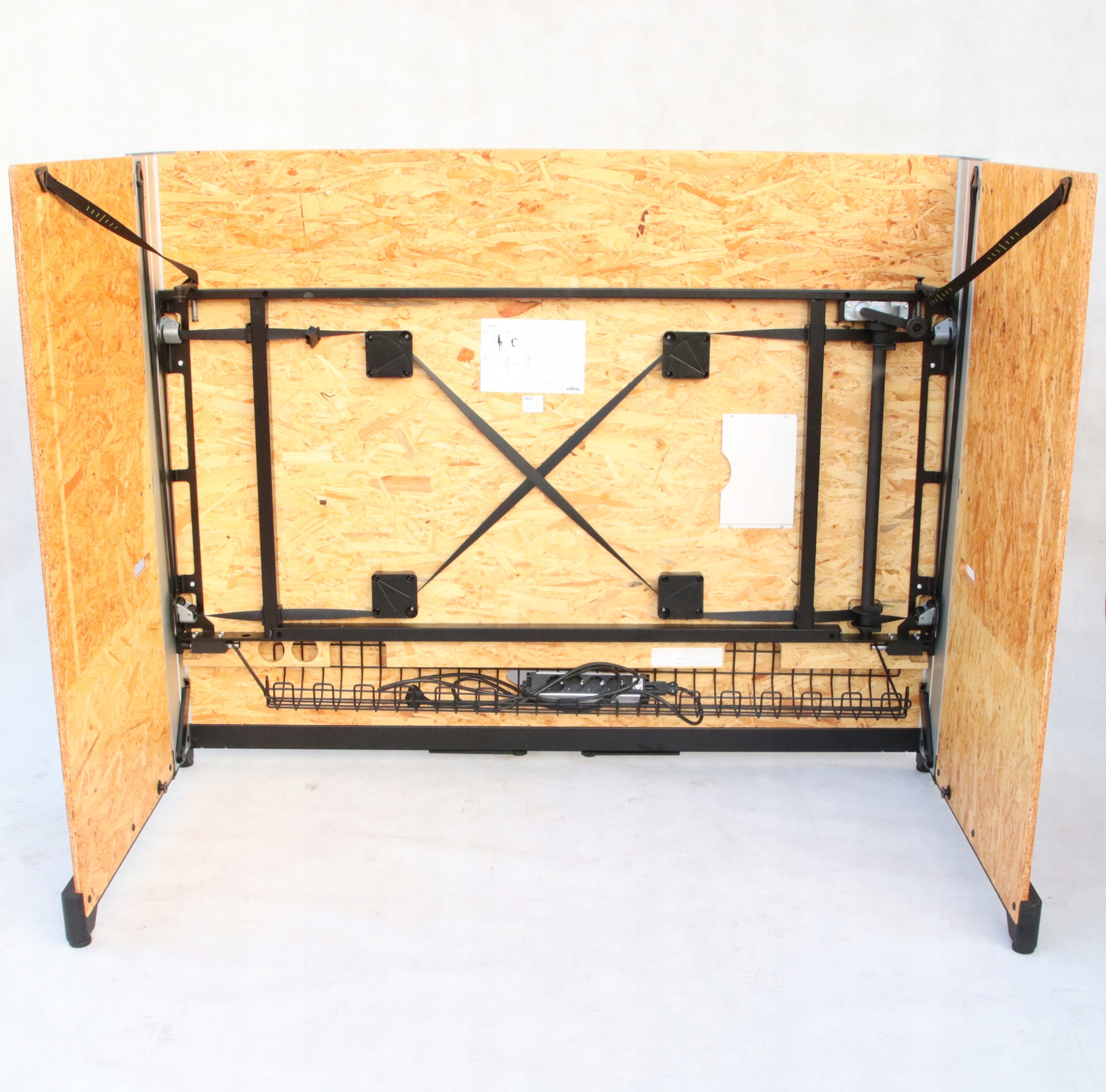 Kanapa jest wykonane z prostokątnych paneli z płyty OSB, które mocuje się w metalowych uchwytach. Dzięki temu możliwe jest podnoszenie lub obniżanie powierzchni biurka, aby użytkownicy mogli pracować na siedząco lub na stojąco.
