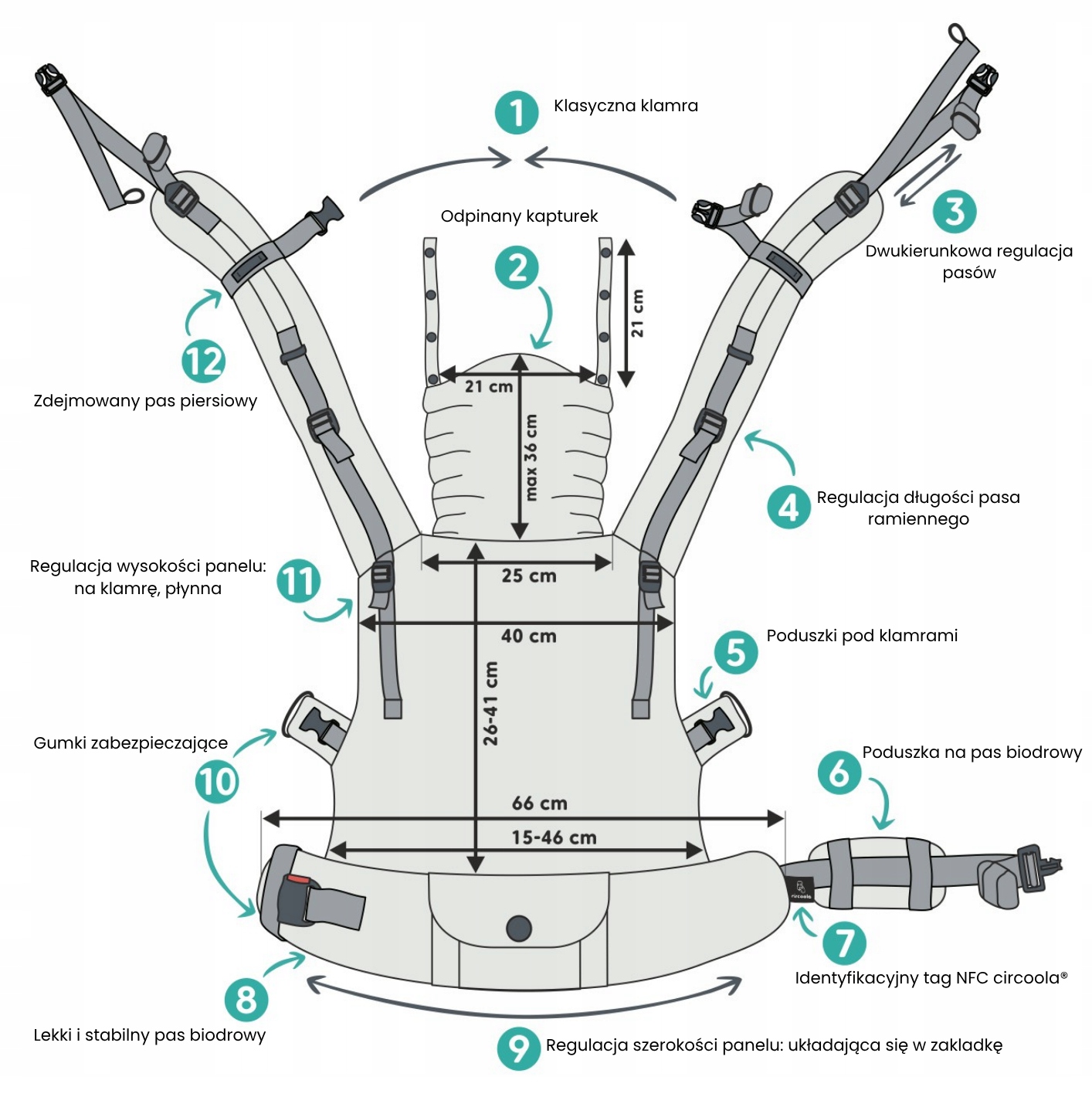 Zakres regulacji pasów nosidełka: