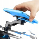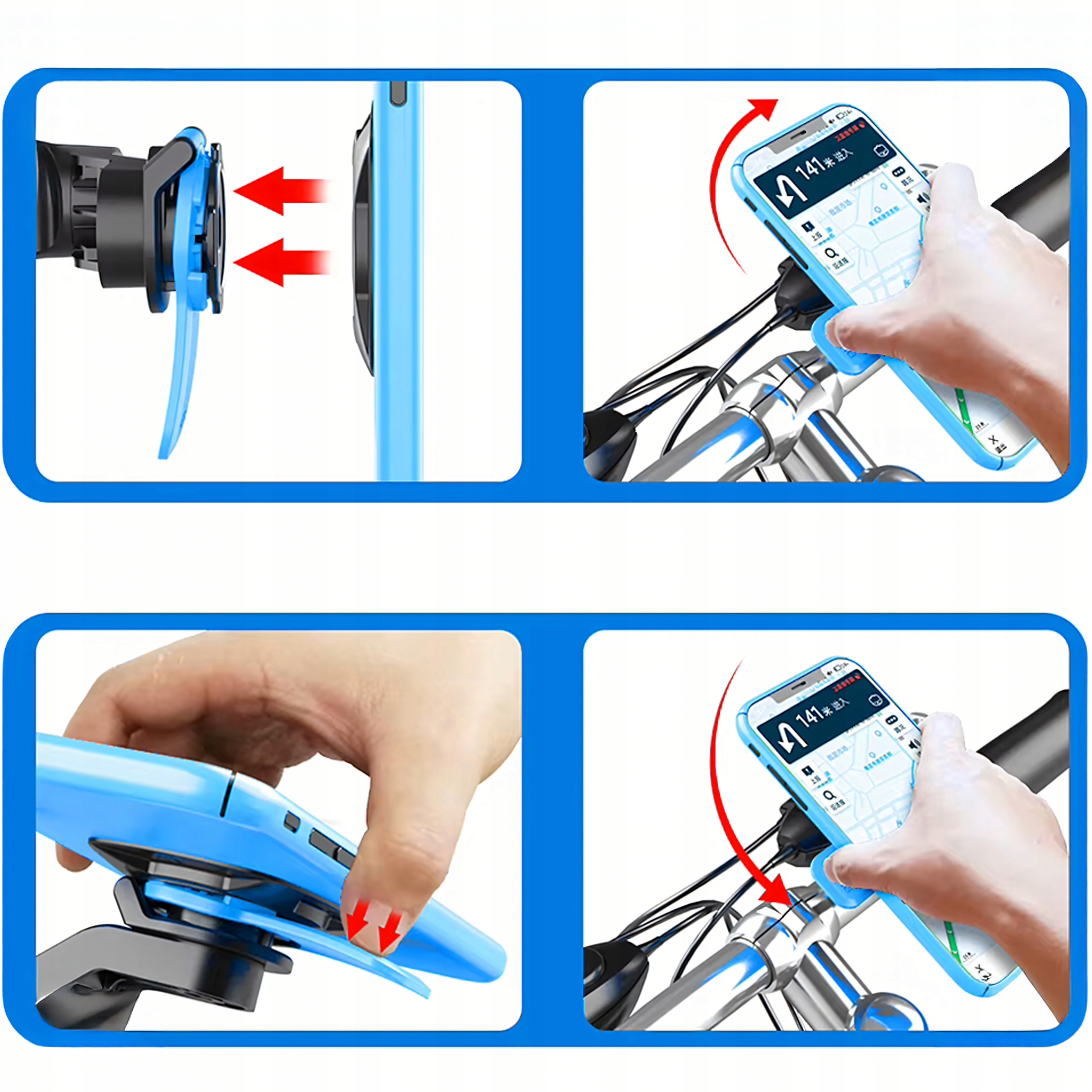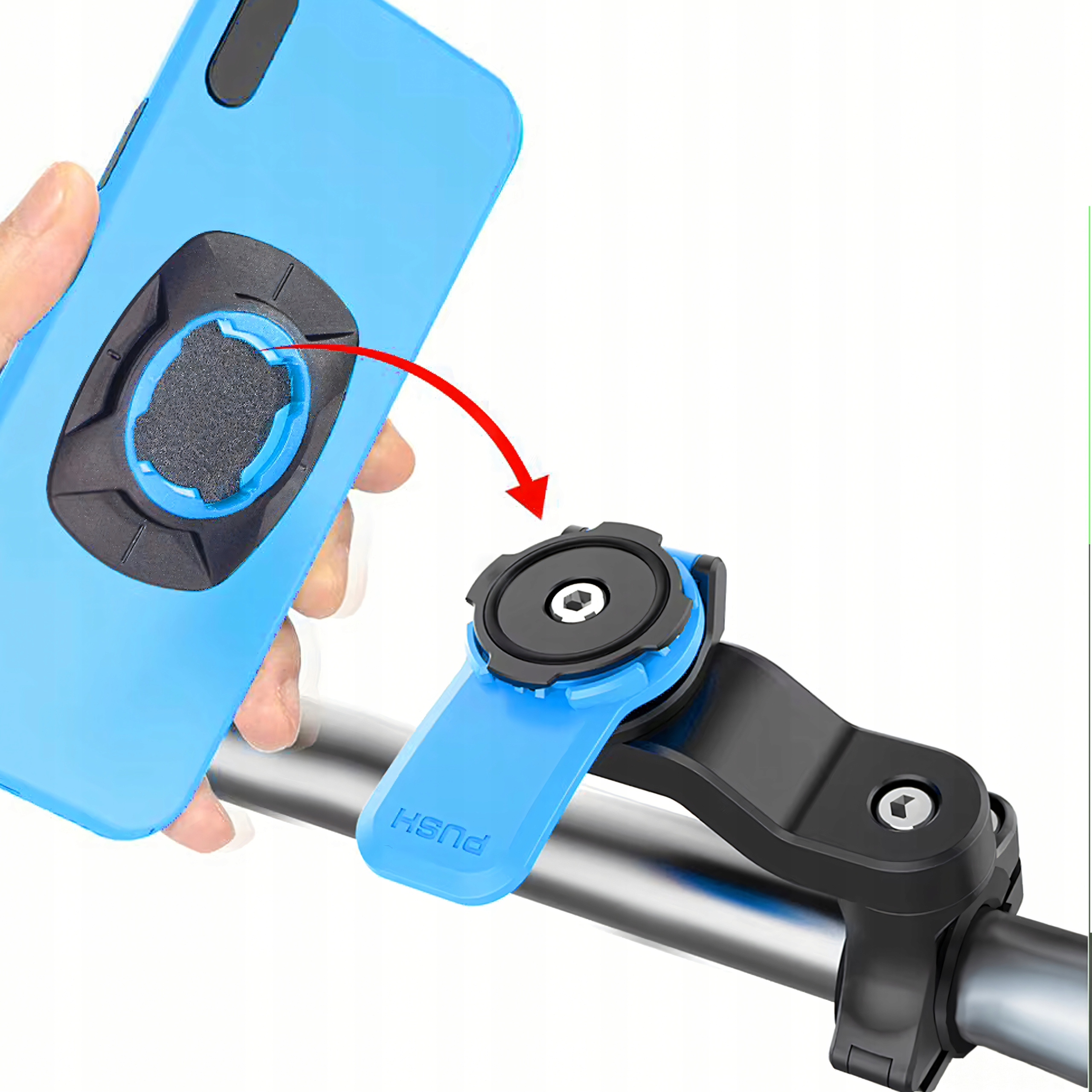 Funkcja LOCK to prosty, jednoetapowy system blokady telefonu. Wystarczy przyłożyć telefon do montażu, nacisnąć niebieski przycisk i obrócić urządzenie — mechanizm zaskoczy i pewnie zablokuje telefon. Szybkie zakładanie i zdejmowanie jedną ręką, pewne trzymanie nawet podczas jazdy w terenie.