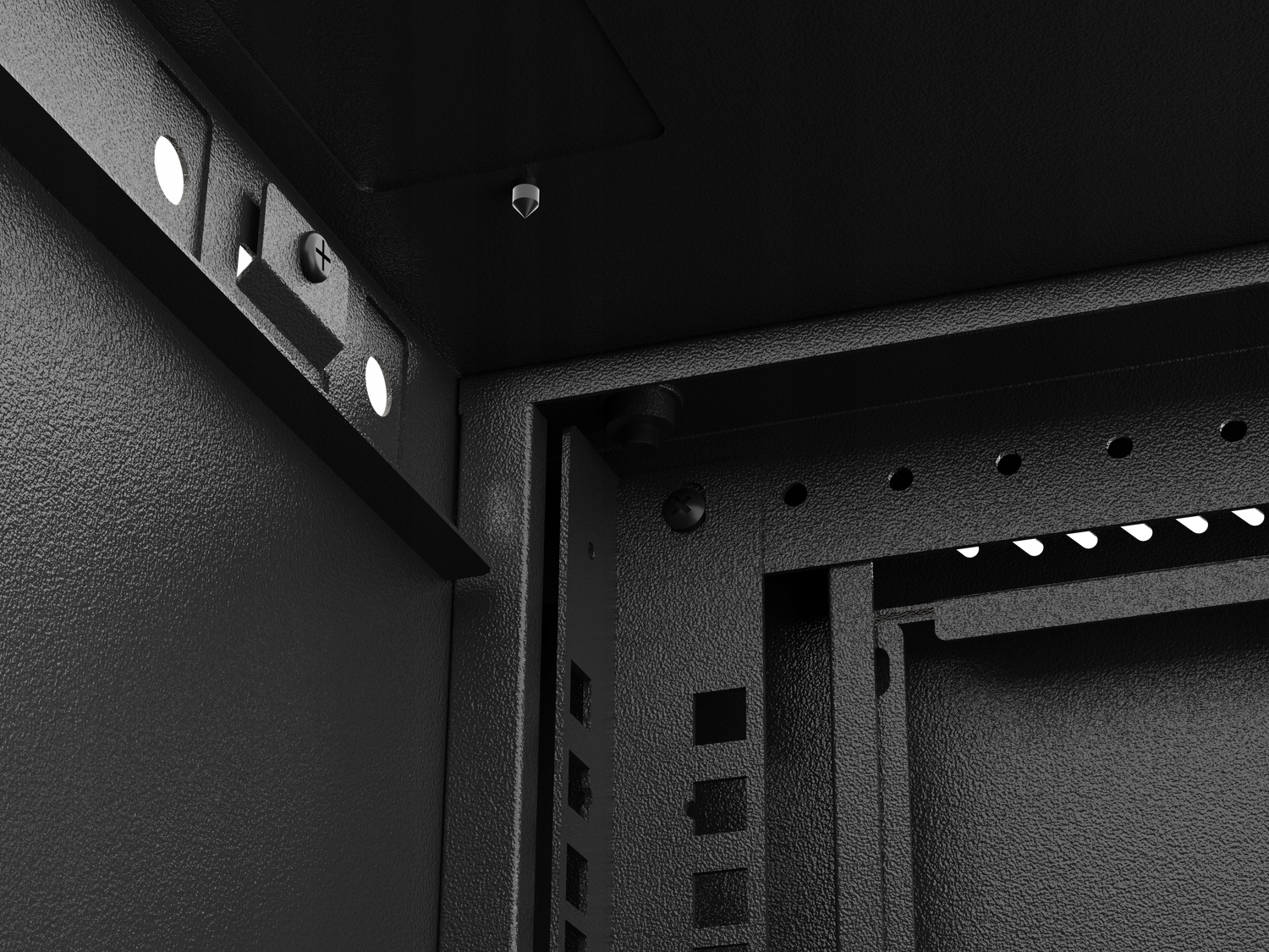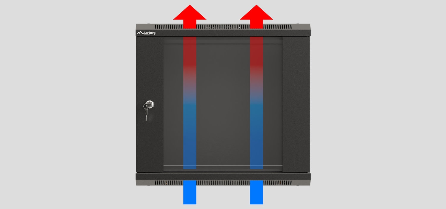 Aby zapewnić odpowiedni przepływ powietrza, w górnym i dolnym panelu znajdują się otwory wentylacyjne. Dodatkowo szafa posiada specjalne miejsce na montaż wentylatora 120×120 mm, co znacznie poprawia cyrkulację powietrza i ogranicza ryzyko przegrzania sprzętu. Dzięki temu szafy WF03 zapewniają optymalne warunki pracy zainstalowanego w nich wyposażenia oraz ich długą żywotność.