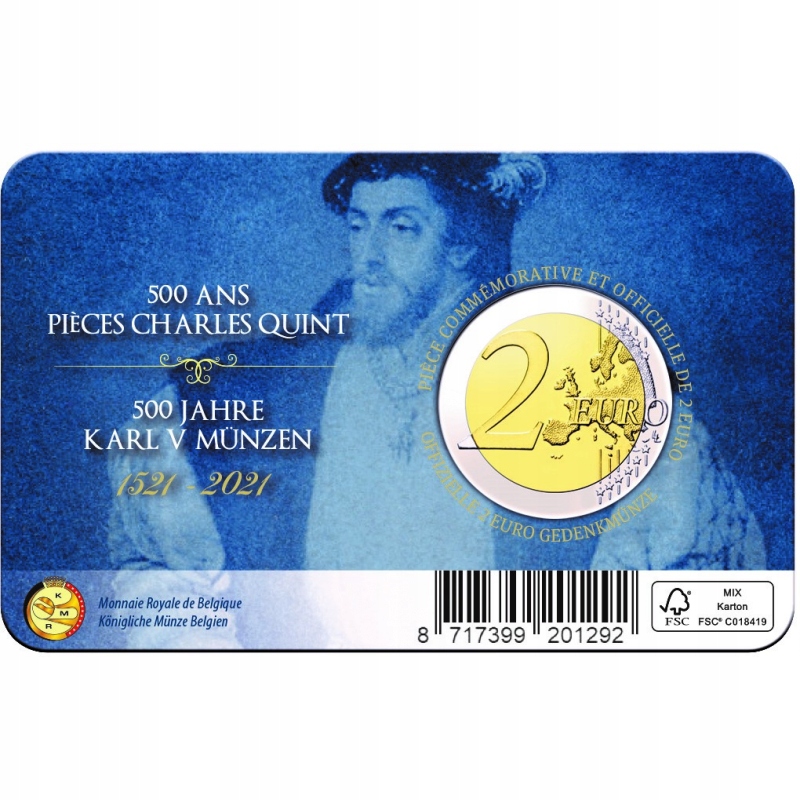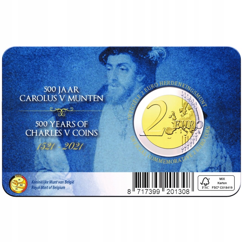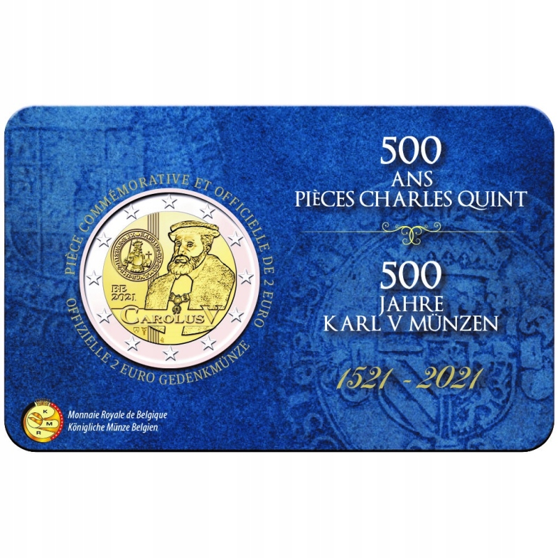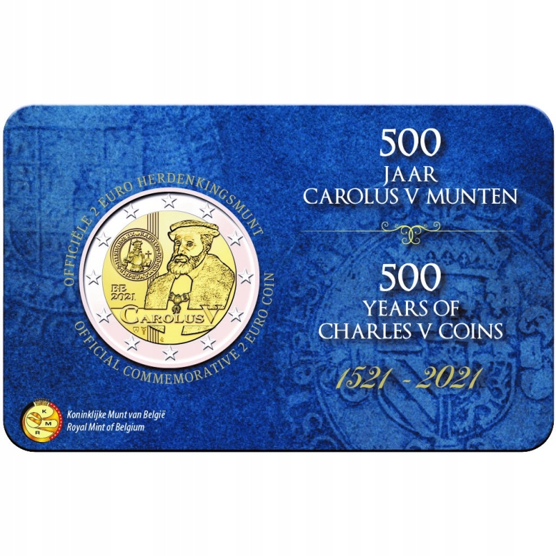 Opis: Na stronie narodowej monety, w części wewnętrznej, przedstawiono wizerunek Karola V wraz z napisem „Carolus V”. Na lewo odzwierciedlono 500-letniego złotego guldena, emitowanego po wydaniu zarządzenia w sprawie drugiego okresu emisji monet za panowania Karola V. Na dole umieszczono znak mennicy w Utrechcie, czyli laskę Merkurego (ponieważ monety będzie bić Holenderska Mennica Królewska), oraz znak mincmistrza Belgii – herb gminy Herzele. Widoczne są również inicjały projektanta monety Luca Luycxa „LL”. Po lewej stronie znajdują się kod kraju „BE” i oznaczenie roku „2021”. W otoku monety widnieje 12 gwiazd z flagi Unii Europejskiej.