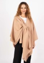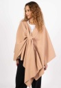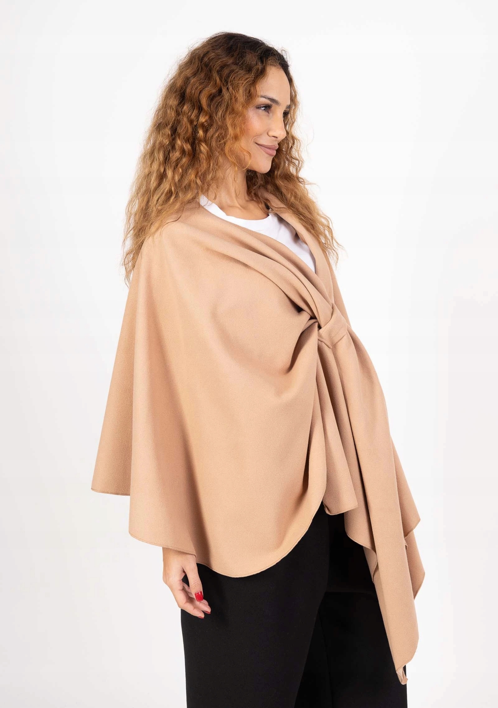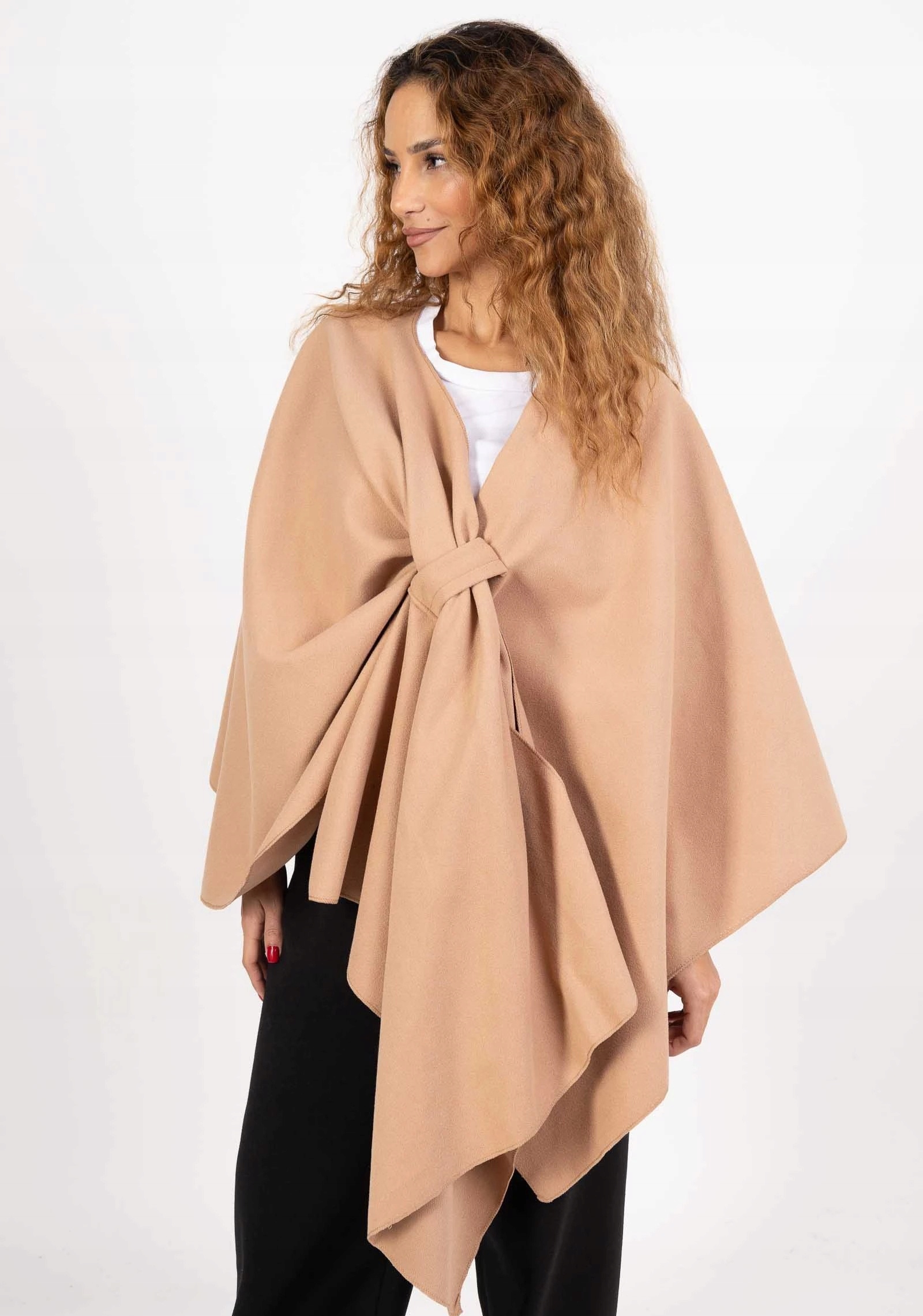 Poncho z finezyjnie wykonanym zapięciem w postaci dużej szlufki w którą wsadza się przedni płat materiału. Ciekawe i innowacyjne rozwiązanie. Poncho stworzone z symetrycznych płatów materiału, luźno opadających na ramiona. Tył krótszy, długości 61 cm. Boki i przód asymetryczny. Idealna kreacja dla pań ceniących nowoczesność i wygodę. Eleganckie i nowoczesne, łatwe w zapięciu i wyjątkowe poncho.