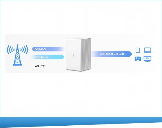 Router MB110-4G korzysta z technologii 4G LTE, aby osiągać wysoką prędkość dochodzącą do 150Mb/s pobierania i do 50Mb/s wysyłania.
