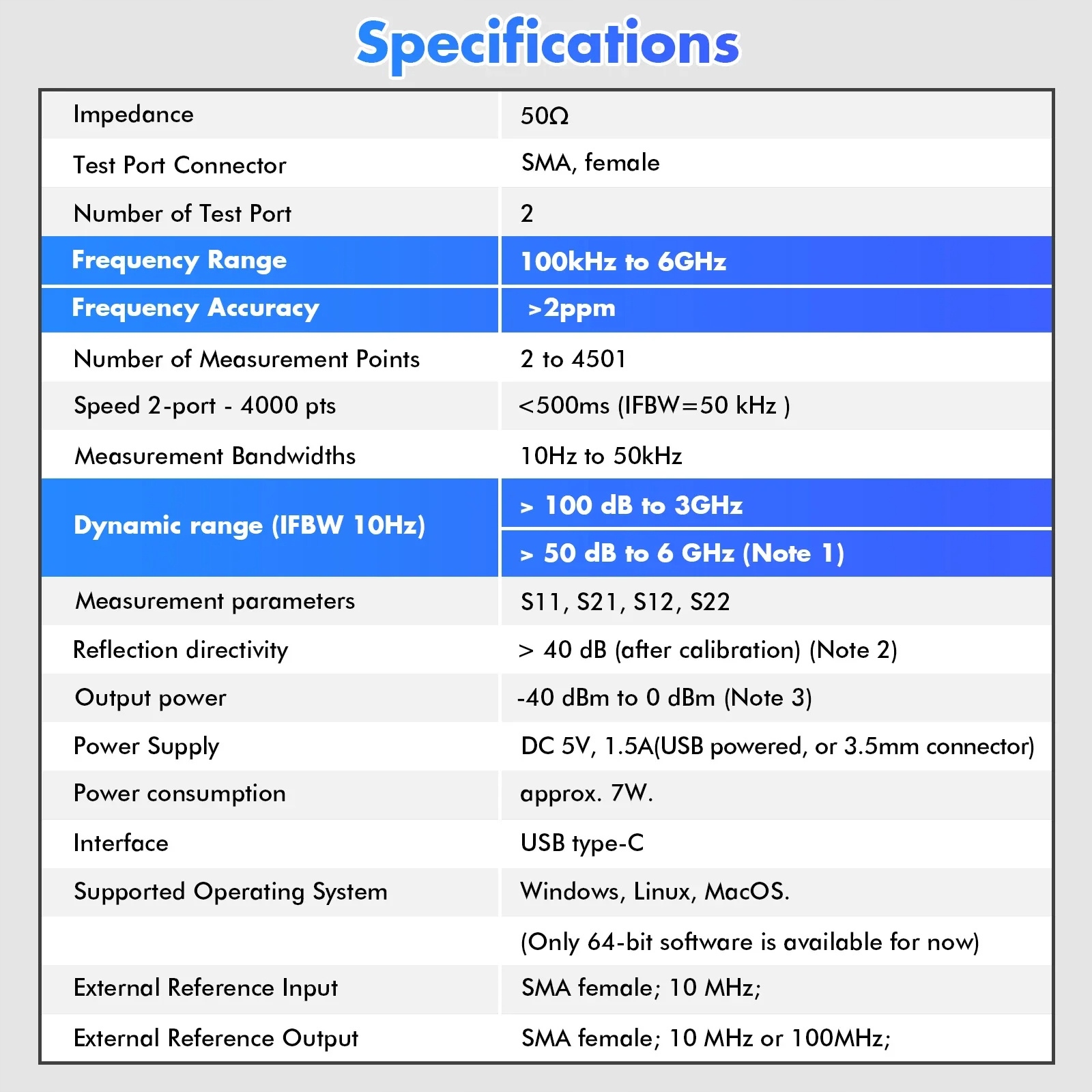 Dzięki precyzyjnej, aluminiowej obudowie CNC, ultraniskoszumnego zasilacza i 16-bitowego przetwornika ADC, urządzenie osiąga imponującą efektywną dynamikę do 100 dB. Jego parametry w wielu aspektach są porównywalne z laboratoryjnymi analizatorami VNA, jednak jest to wciąż rozwijany projekt. Prosimy o zapoznanie się z pełnymi specyfikacjami i możliwymi ograniczeniami przed zakupem.
