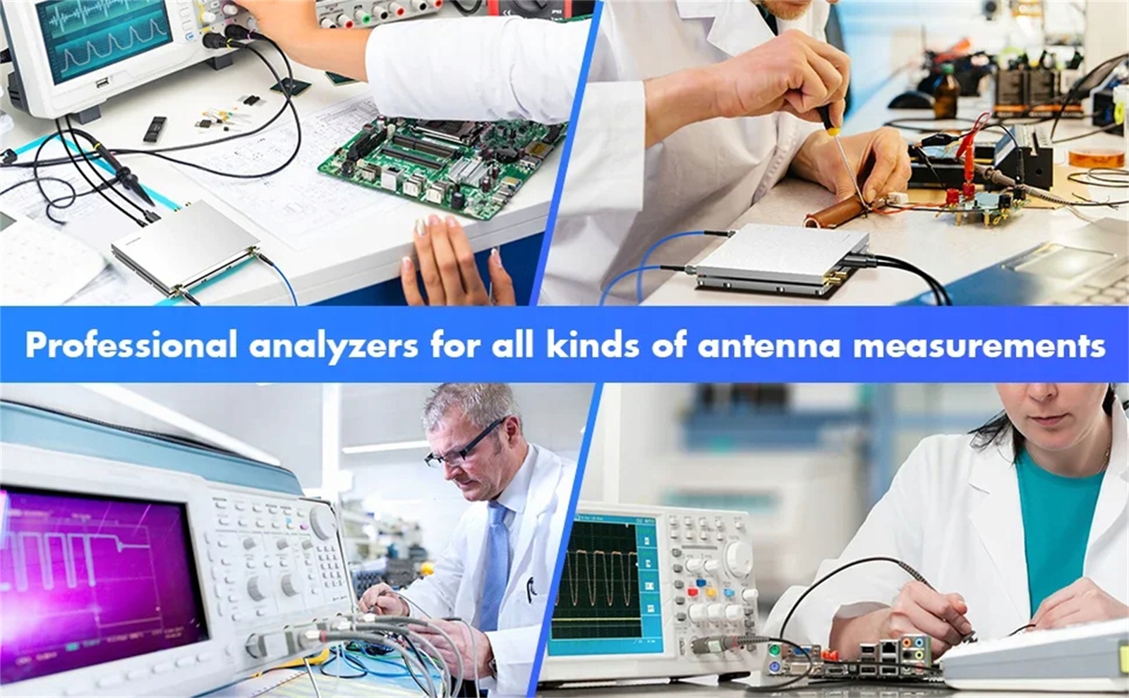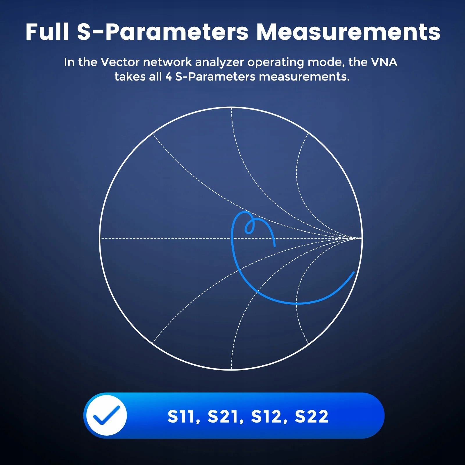Pełny analizator VNA: Mierzy wszystkie parametry rozproszenia (S11, S21, S12, S22) dla kompleksowej charakterystyki urządzeń.