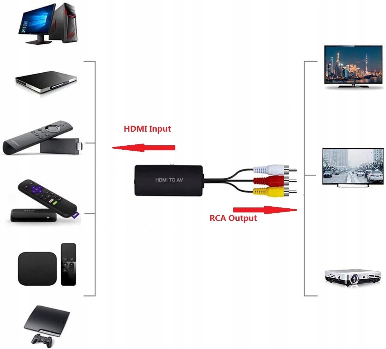 Umożliwia podłączenie nowoczesnych urządzeń z portem HDMI (nie posiadających gniazd RCA), takich jak odtwarzacze DVD/Blu-Ray i konsole do gier do telewizorów lub projektorów starszego typu nie wyposażonych w port HDMI.