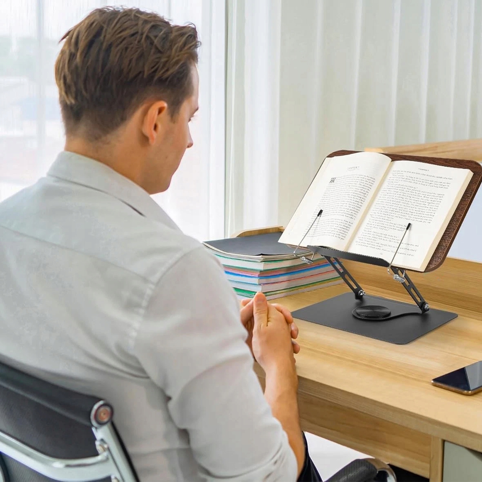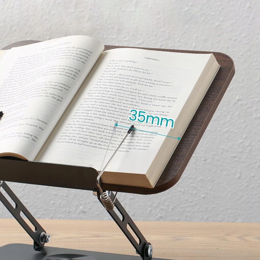 Kompaktowy, składany i wytrzymały: Dzięki wymiarom podstawy 30 × 23,8 × 5,7 cm (podstawa: 23,5 × 18,5 cm) stojak na książki jest łatwy do przechowywania i gotowy do użycia w dowolnym miejscu. Elastyczne podpórki boczne utrzymują książki o grubości do 35 mm – idealne do grubych książek kucharskich lub materiałów do nauki. Udźwig do 3 kg.