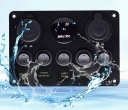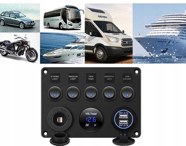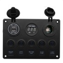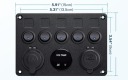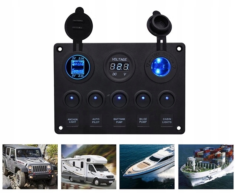 Panel składa się z gniazda zapalniczki, pięciu włączników, cyfrowego woltomierza wyświetlającego aktualny poziom napięcia akumulatora i dwóch portów USB szybkiego ładowania o napięciu 5V 4.2A (2.1A + 2.1A).
