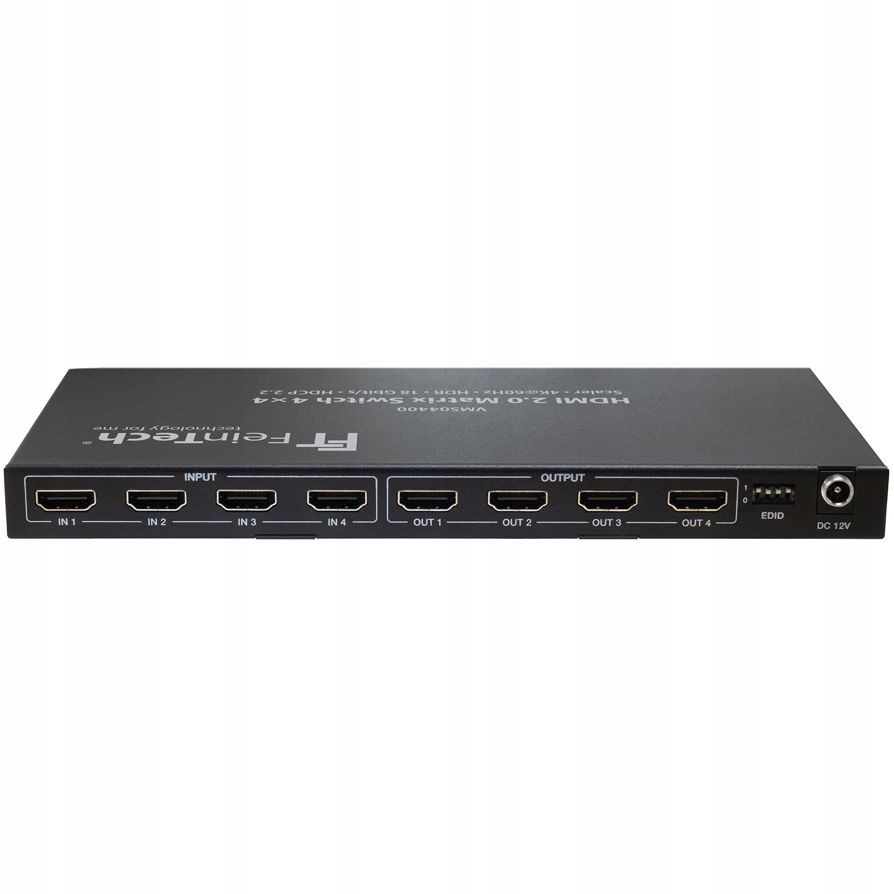 FeinTech VMS04400 to profesjonalny przełącznik matrycowy HDMI 2.0 typu 4x4. Produkt pozwala na swobodne i jednoczesne przypisywanie 4 źródeł HDMI do 4 odbiorników, takich jak telewizory, projektory, odbiorniki AV czy karty rejestrujące. Każde wejście może być skierowane do każdego z wyjść, tworząc elastyczną konfigurację sygnału – zarówno 1 na 4, jak i 2 na 2 czy dowolną inną kombinację.