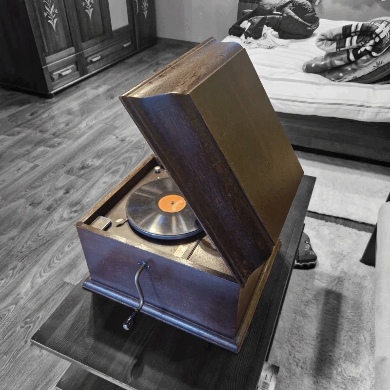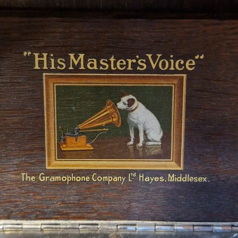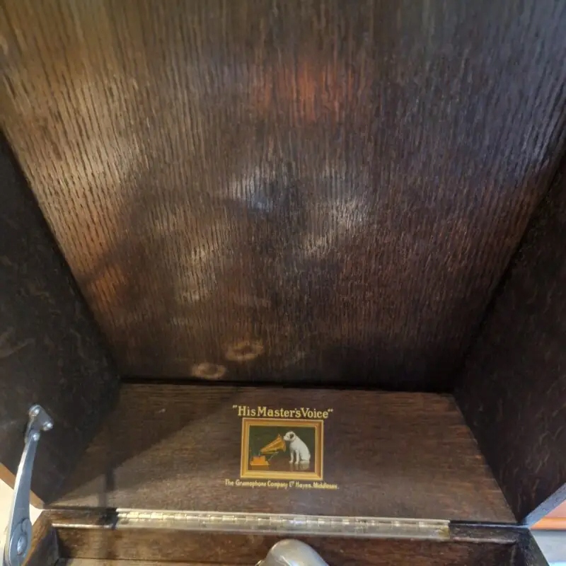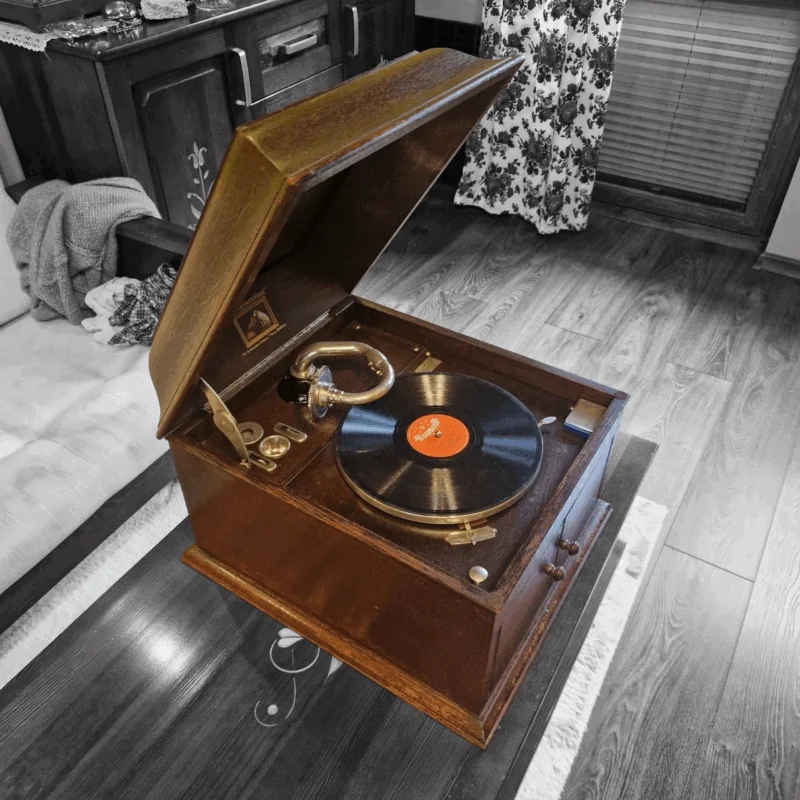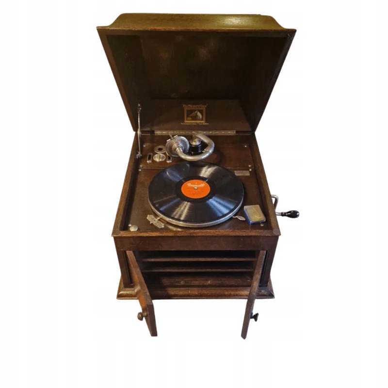 Pięknie utrzymany gramofon Angielskiej firmy The Gramophone Company Ltd. z Hayes, Middlesex, z widocznym pięknym znakiem towarowym His Master’s Voice [Głos jego Pana] znak towarowy przedstawia psa Nipperka słuchającego Gramofonu. Gramofon gra pięknie, bardzo głośno po otwarciu dwojga drzwiczek, głośność regulowana przez otwarcie drzwiczek, zapasowe igły, sprężyna w stanie dobrym, do gramofonu dwie oryginalne płyty; pierwszy to winylowy singiel wydany przez His Master’s Voice, tytuł utworu; ,, Lambeth Walk – Fox- Trot ” z misicalu ,, Me and My Girl. Wykonawca; Ronnie Munro &His Orchestra. Druga płyta winylowa to wydanie Polydor N78 strona A zawiera utwór ,, Wenn du kein Madel weibt w wykonaniu Lale Andersen z chórem i dużą orkiestrą smyczkową.