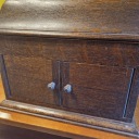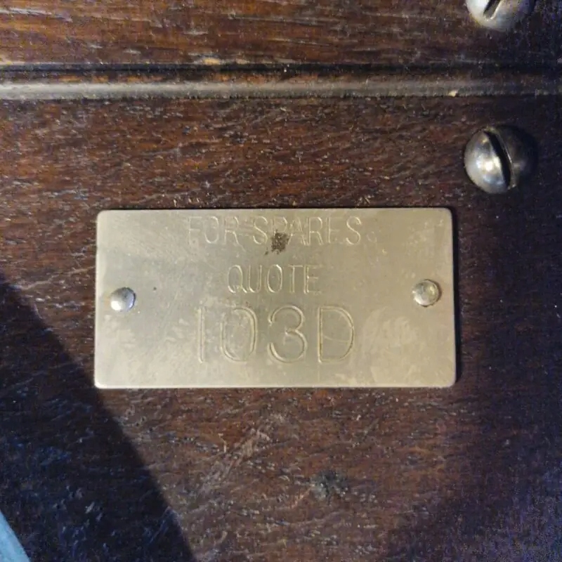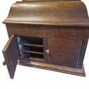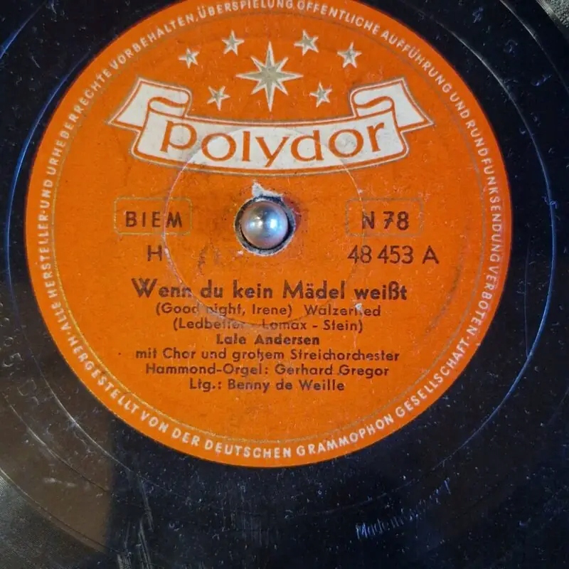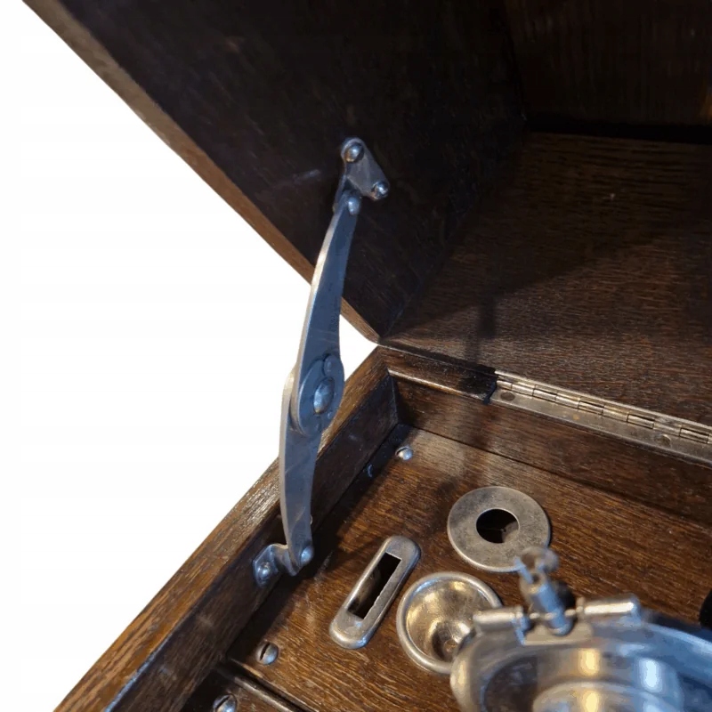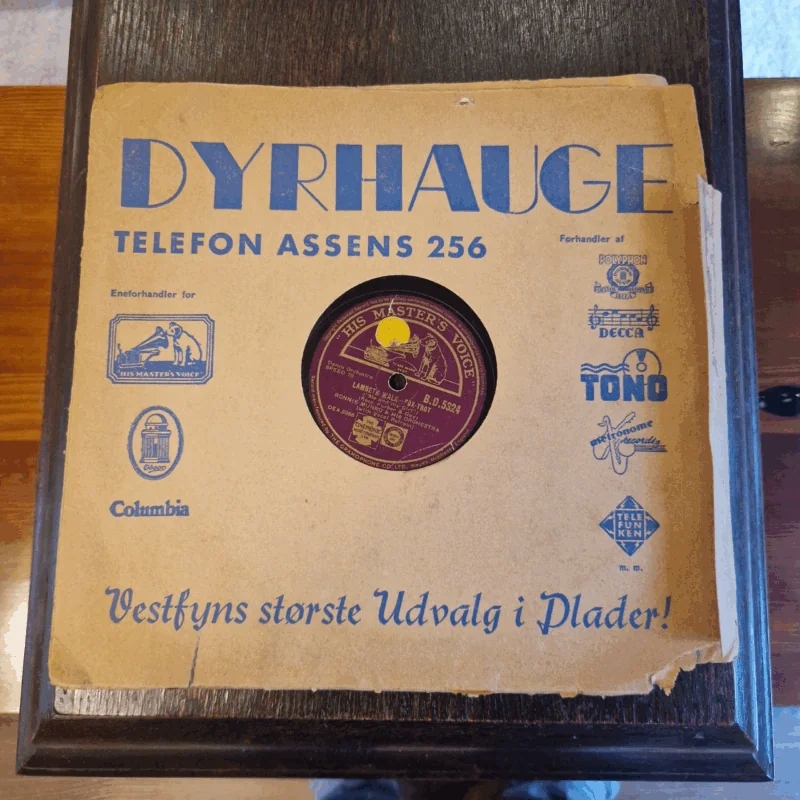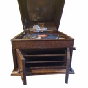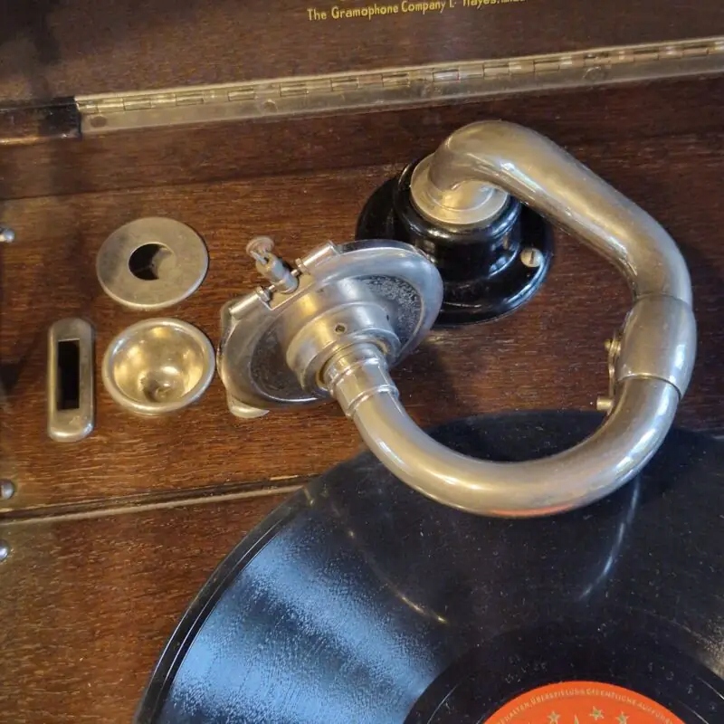 Pięknie utrzymany gramofon Angielskiej firmy The Gramophone Company Ltd. z Hayes, Middlesex, z widocznym pięknym znakiem towarowym His Master’s Voice [Głos jego Pana] znak towarowy przedstawia psa Nipperka słuchającego Gramofonu. Gramofon gra pięknie, bardzo głośno po otwarciu dwojga drzwiczek, głośność regulowana przez otwarcie drzwiczek, zapasowe igły, sprężyna w stanie dobrym, do gramofonu dwie oryginalne płyty; pierwszy to winylowy singiel wydany przez His Master’s Voice, tytuł utworu; ,, Lambeth Walk – Fox- Trot ” z misicalu ,, Me and My Girl. Wykonawca; Ronnie Munro &His Orchestra. Druga płyta winylowa to wydanie Polydor N78 strona A zawiera utwór ,, Wenn du kein Madel weibt w wykonaniu Lale Andersen z chórem i dużą orkiestrą smyczkową.