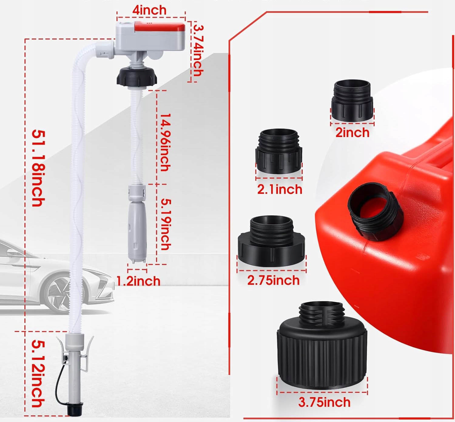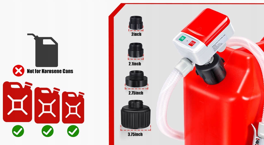 Dopasowanie do wszystkich standardowych zbiornikówAdaptery o rozmiarach 5,1/5,3/7,0/9,5 cm – kompatybilne z większością zbiorników paliwa z Ameryki Północnej, zbiornikami oleju i pojemnikami na płyny.Międzyna z trwałego polietylenu: