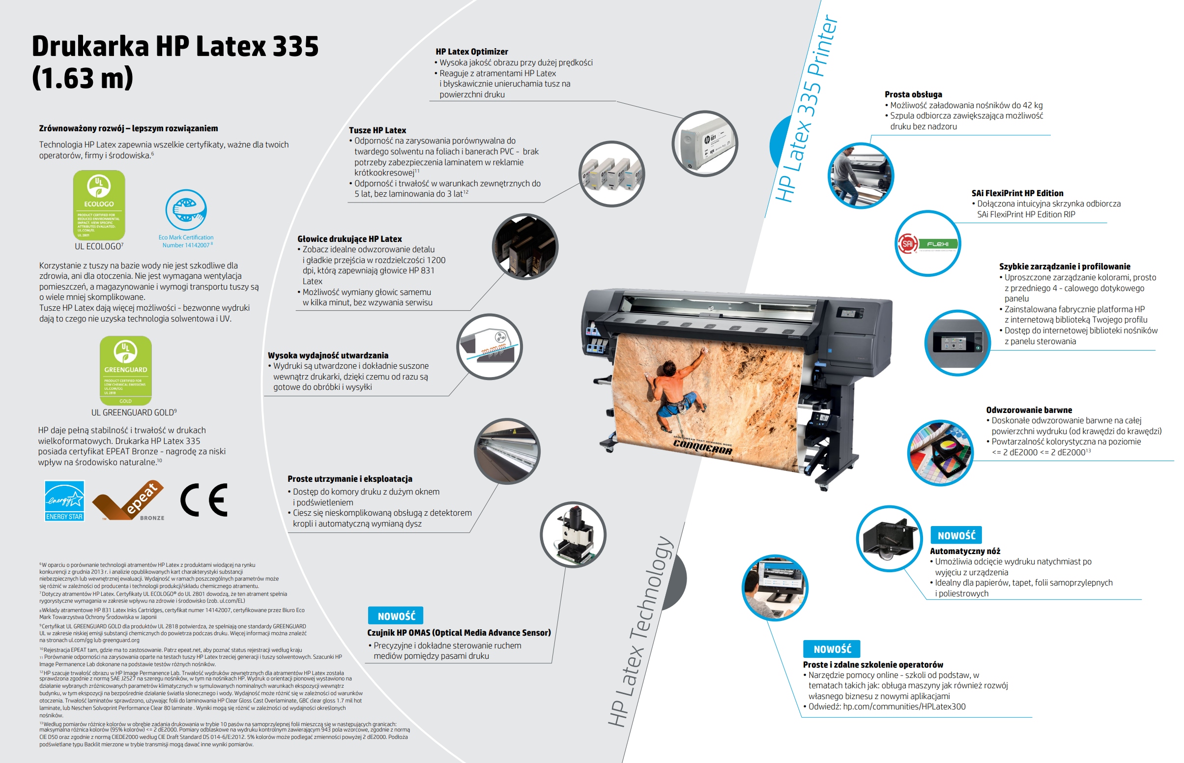 HP Latex 335 to urządzenie pozwalające na druk aplikacji przeznaczonych do stosowania zarówno do wnętrz jak i na zewnątrz pomieszczeń. Umożliwia szybkie drukowanie na wielu różnych podłożach co w praktyce przekłada się na możliwość powiększenia oferty oraz swojej przewagi konkurencyjnej.