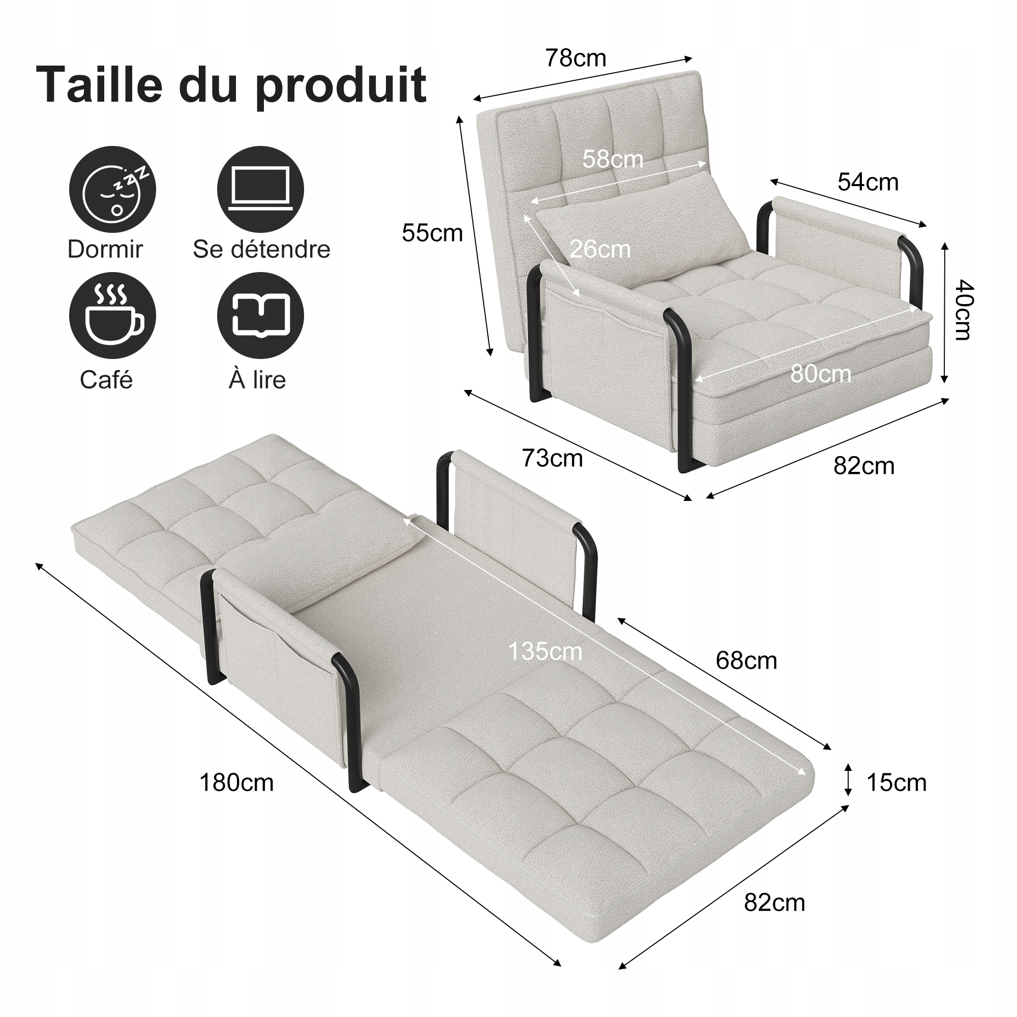 3. Funkcja rozkładanej sofy 2 w 1: Bezproblemowo przekształca się z kompaktowej sofy (82×80 cm) w pełnowymiarowe łóżko (180×82 cm), idealne do małych mieszkań, biur domowych lub przyjmowania gości nocujących.