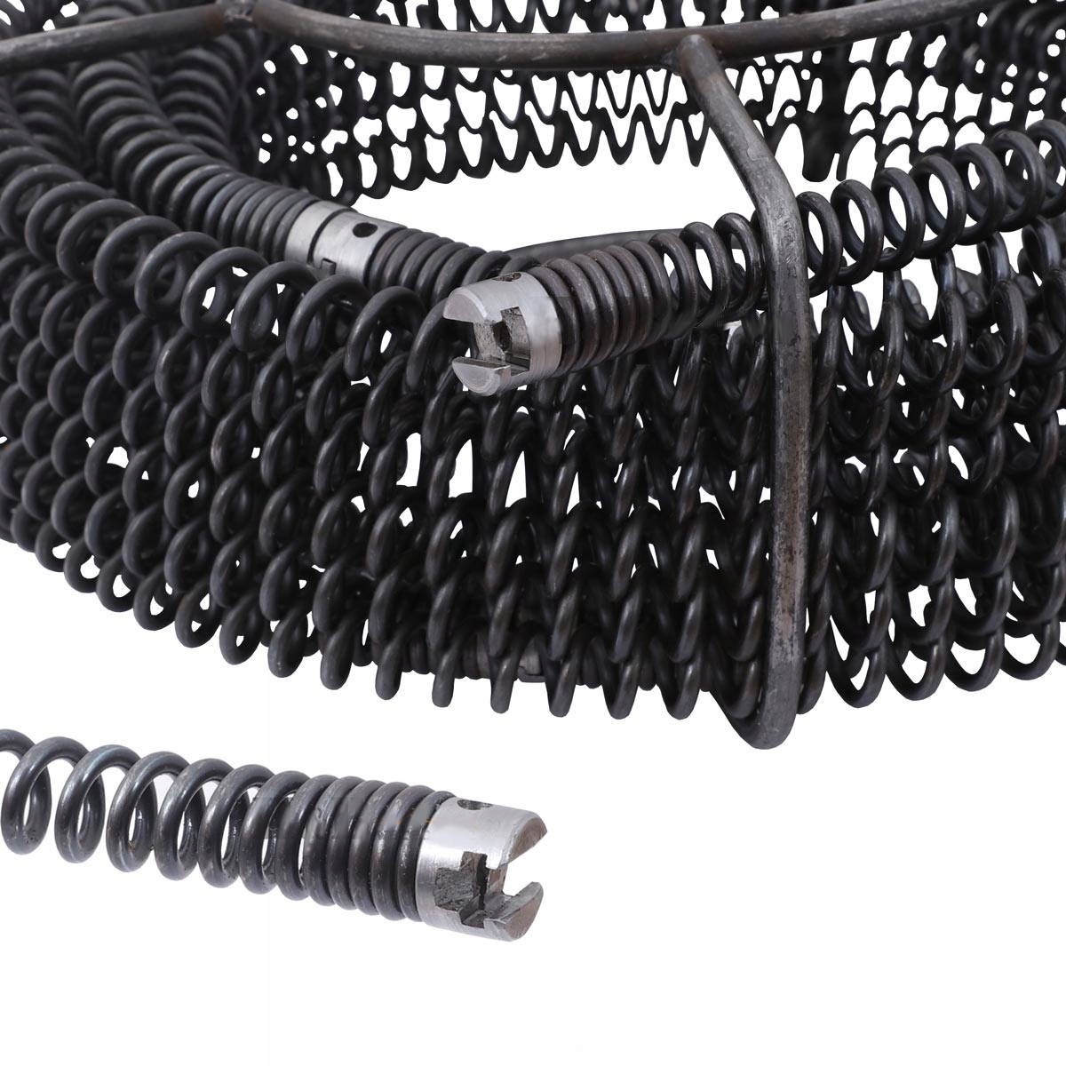 Poręczny i niezawodny zestaw łączonych elastycznych i mocnych sprężyn kanalizacyjnych nawiniętych w specjalny stalowy i mocny bęben.